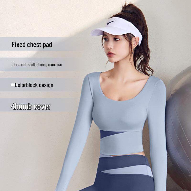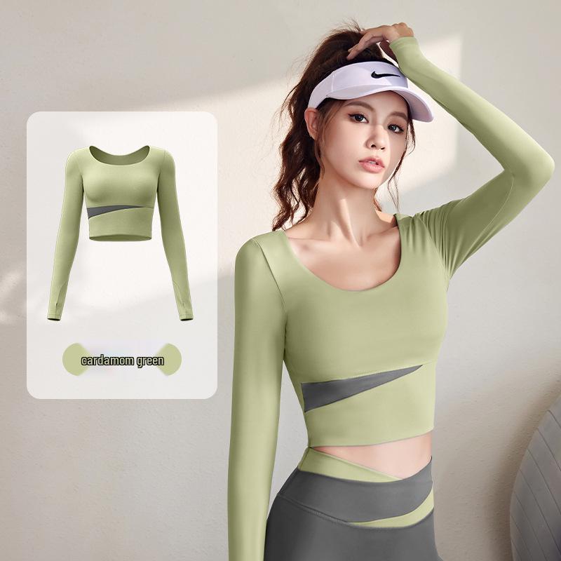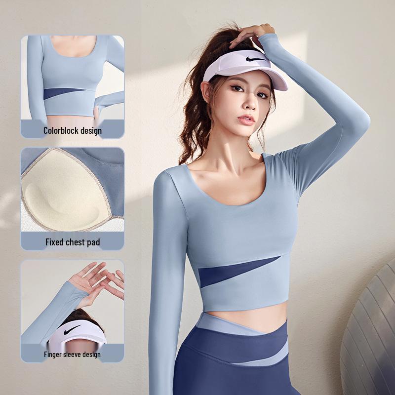 Женский весенний цветной блок комплект для йоги - Облегающий топ и лонгслив с ощущением обнаженности, нагрудные вкладыши, модные брюки для бега и фитнеса