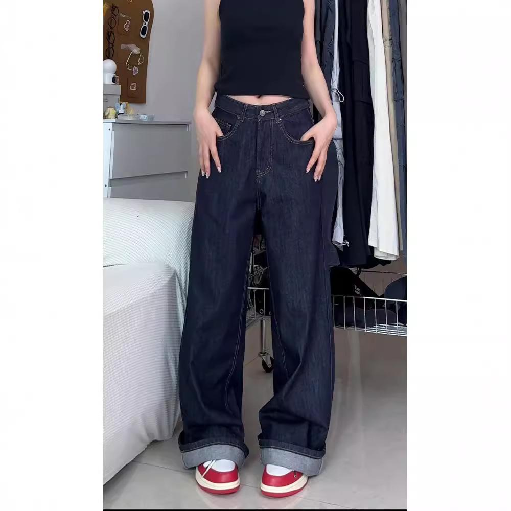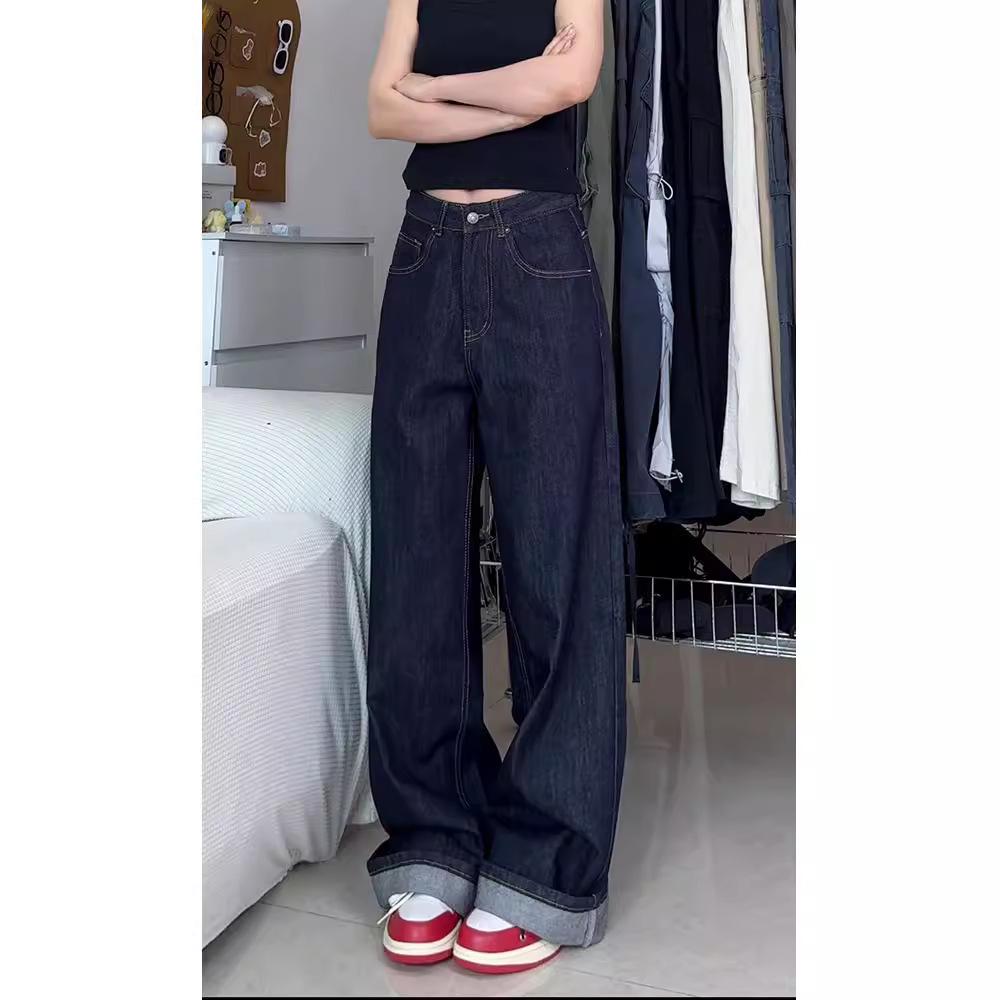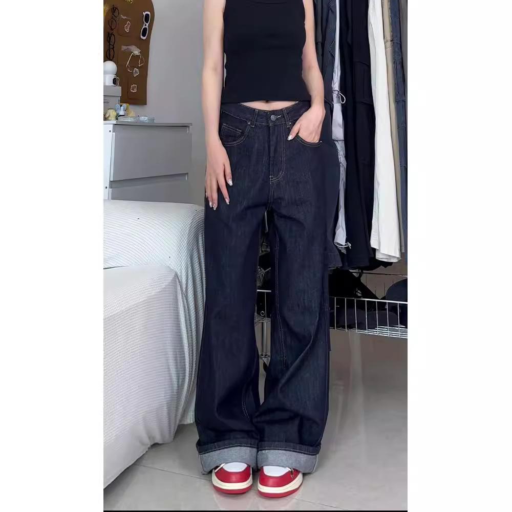 Женские джинсы больших размеров в стиле ретро, темно-синие, с широкими штанинами, с высокой посадкой, для осени