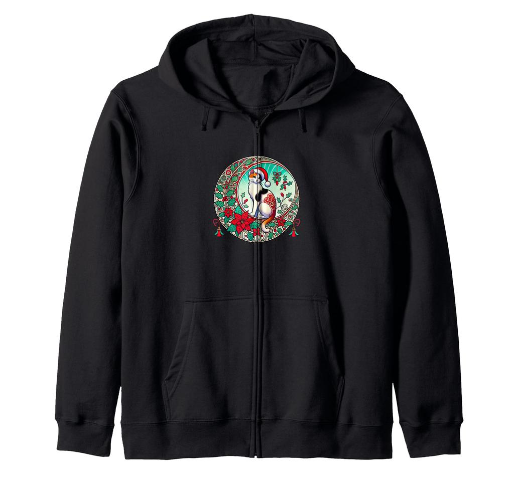 Иллюстрация кошки калико в шапке Санты в стиле ар-нуво, толстовка на молнии с кошкой калико