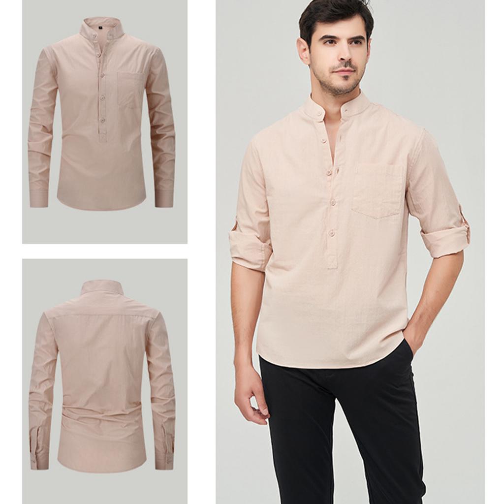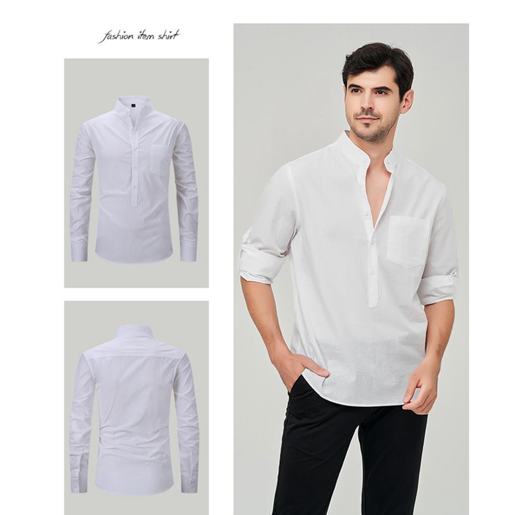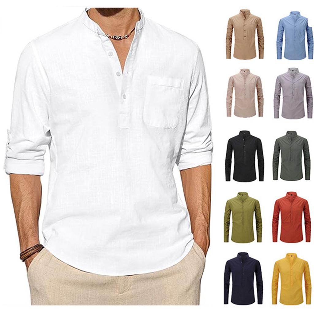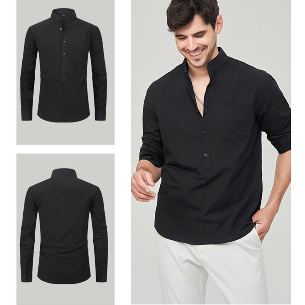 Мужская модная рубашка с воротником-стойкой, однотонная, повседневная, с длинными рукавами