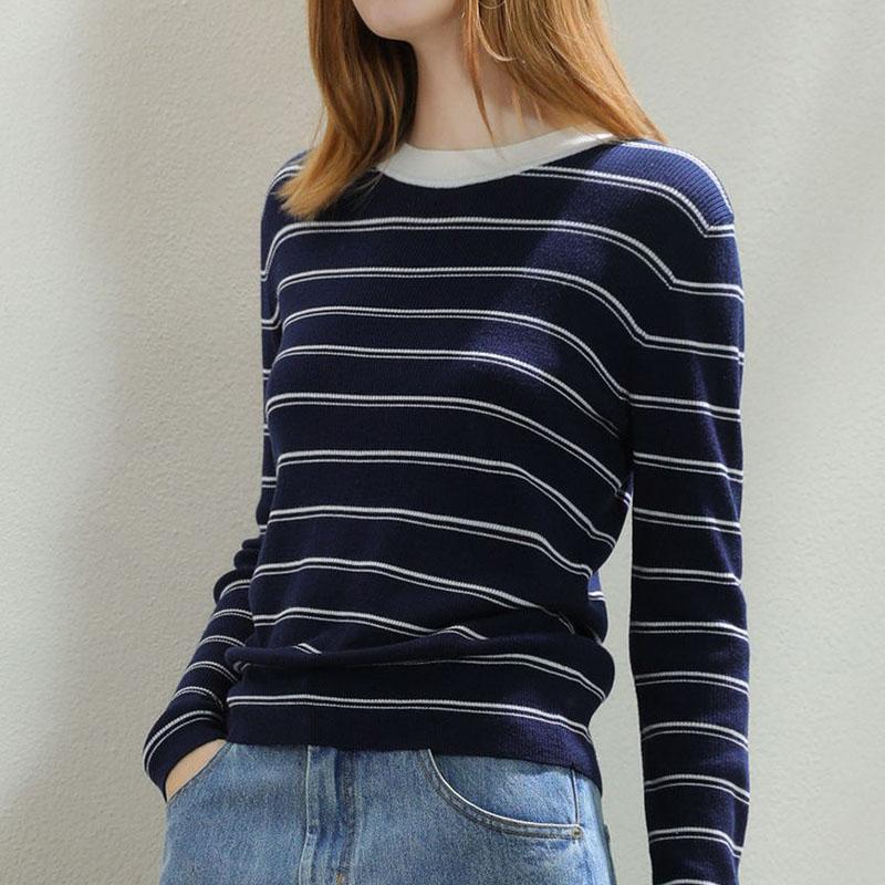 Новый осенне-зимний французский винтажный полосатый контрастный трикотажный свитер с круглым вырезом, облегающего кроя, универсальный, омолаживающий, в западном стиле, для женщин