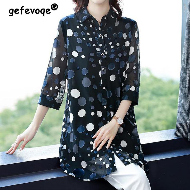 Повседневная винтажная рубашка в горошек на пуговицах с длинным рукавом, летняя новинка для офисных леди, с воротником поло, рукавом три четверти, свободный топ, женская одежда