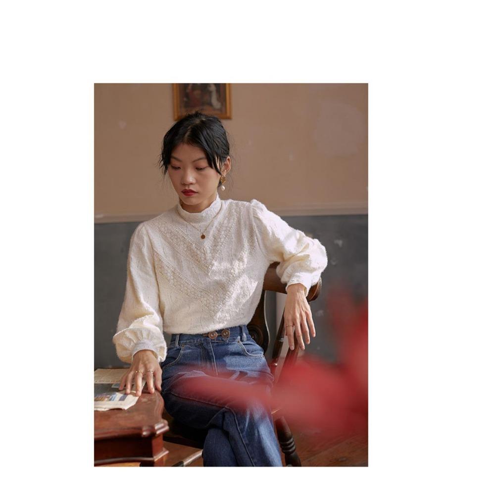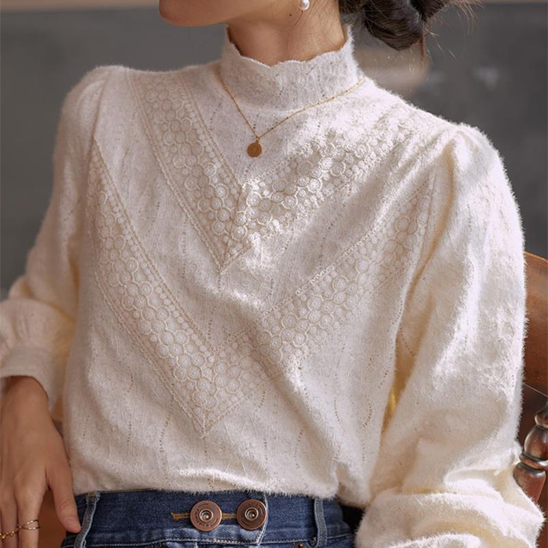 Французский придворный стиль Полувысокий воротник Блузка-основа из матового кружева для женщин Осень и зима Топ для многослойности