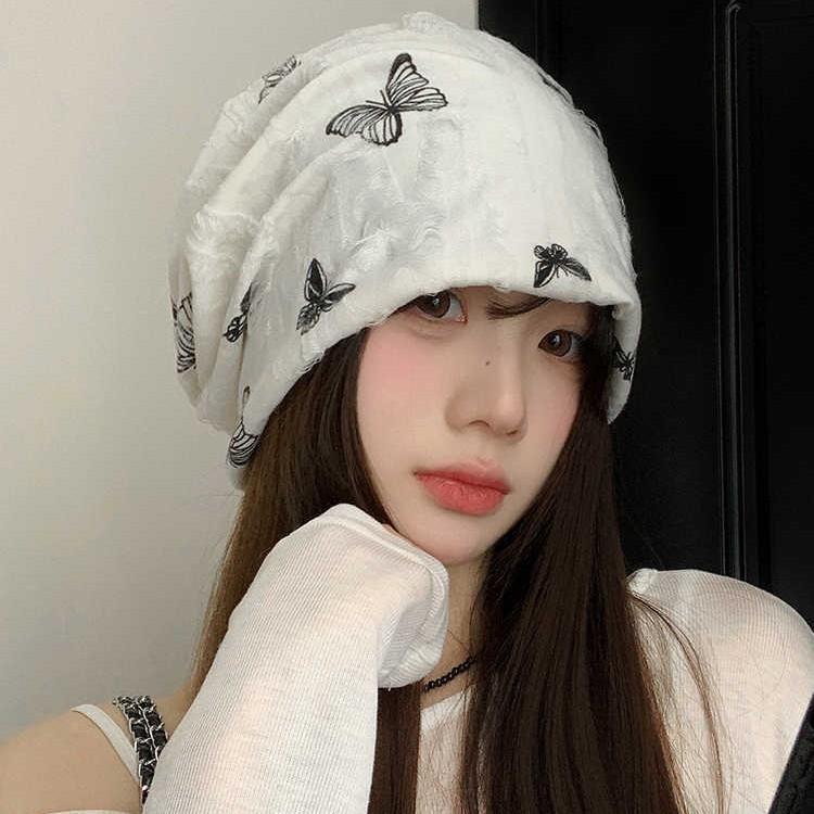 Шапка-бини с вышивкой бабочки, осенне-зимняя шапка, женская ретро-универсальная теплая шапка-мешок, облегающая шапка, маленькая шапка от холода, подчеркивающая лицо