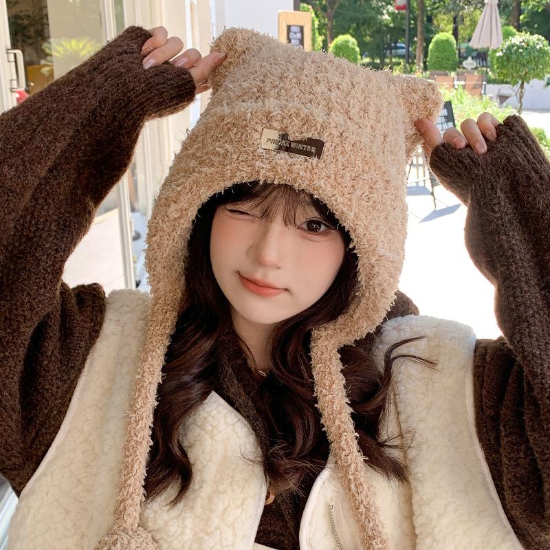 Осенне-зимняя шапка женская милая с медвежьими ушками вязаная шерстяная шапка зимняя теплая плюшевая шапка с защитой ушей толстая