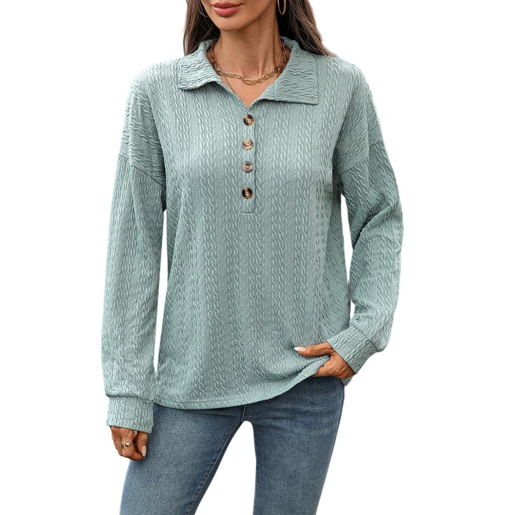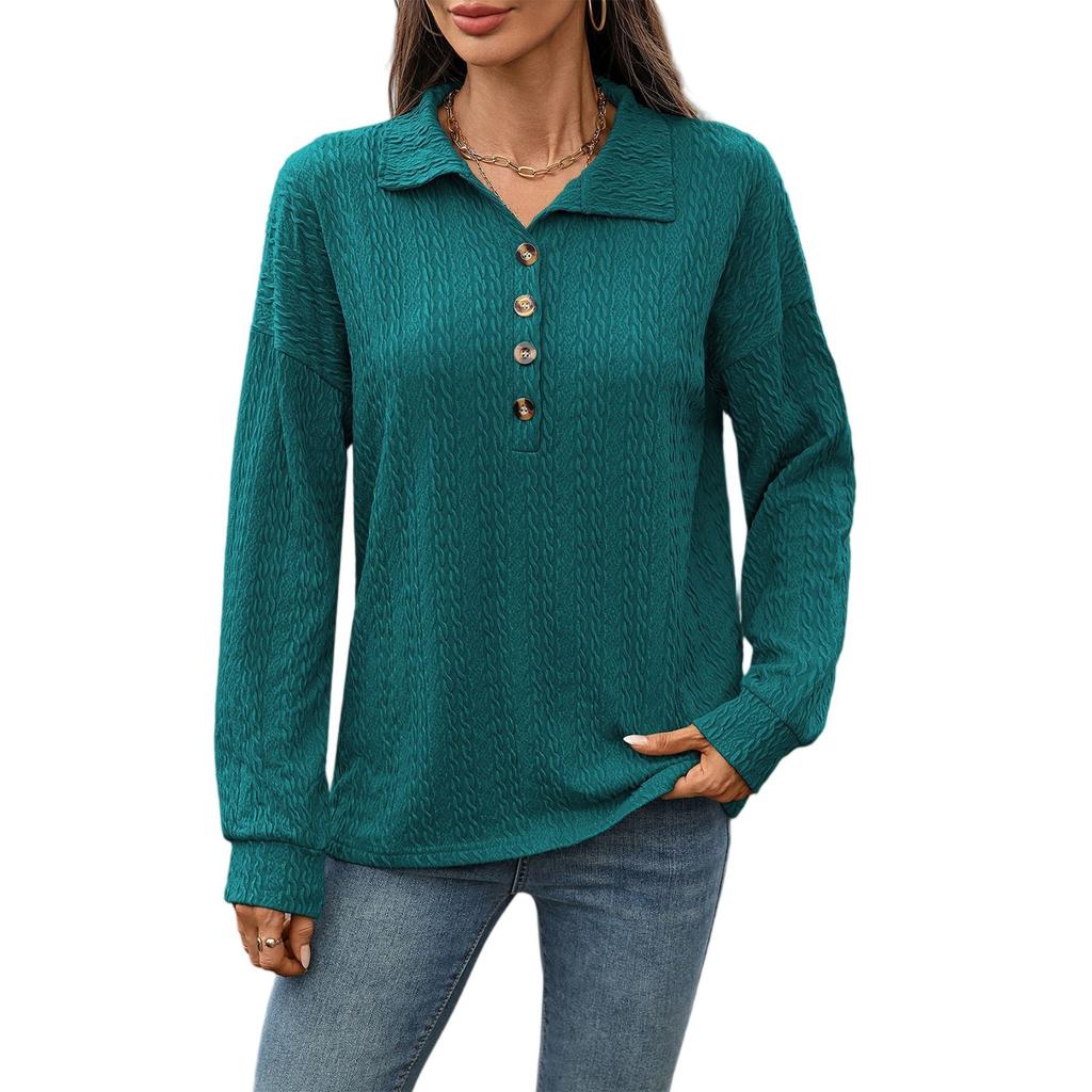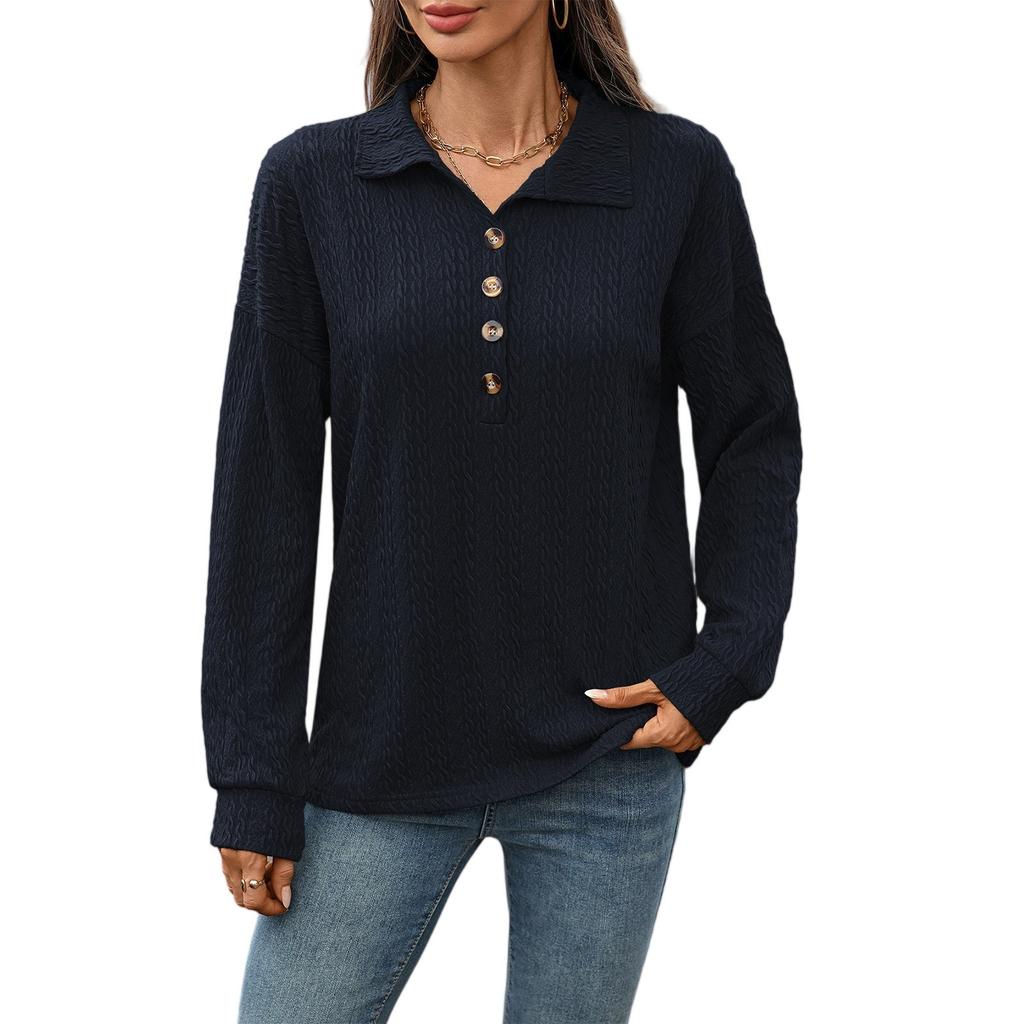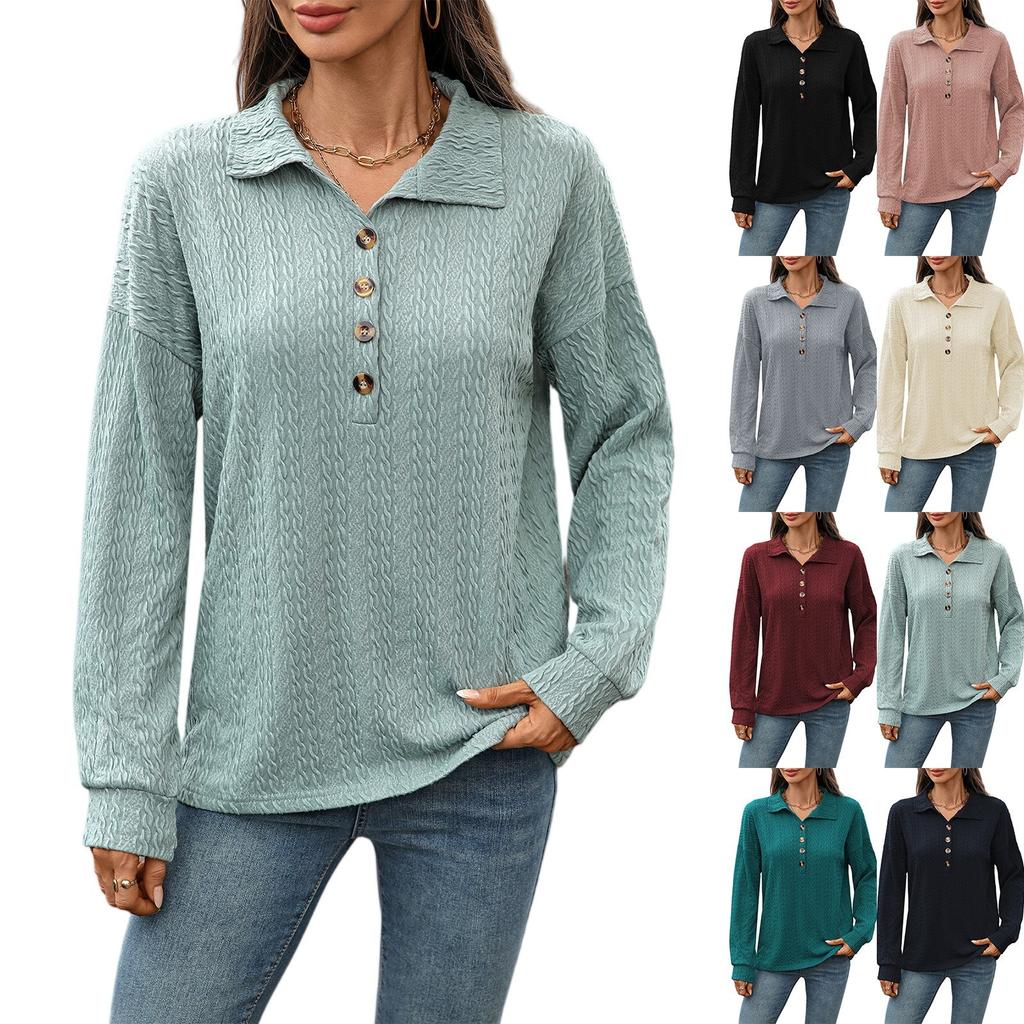 Женская мода Однотонный лацкан Пуговицы Отделка Свободный Лонгслив Футболка Топ