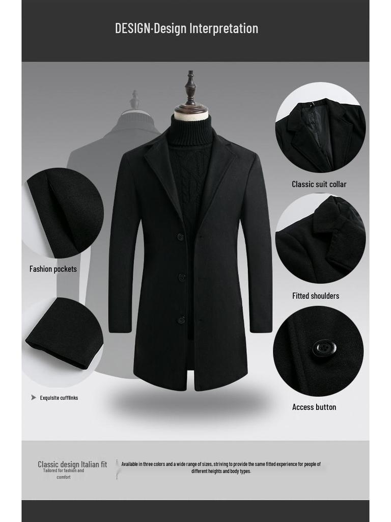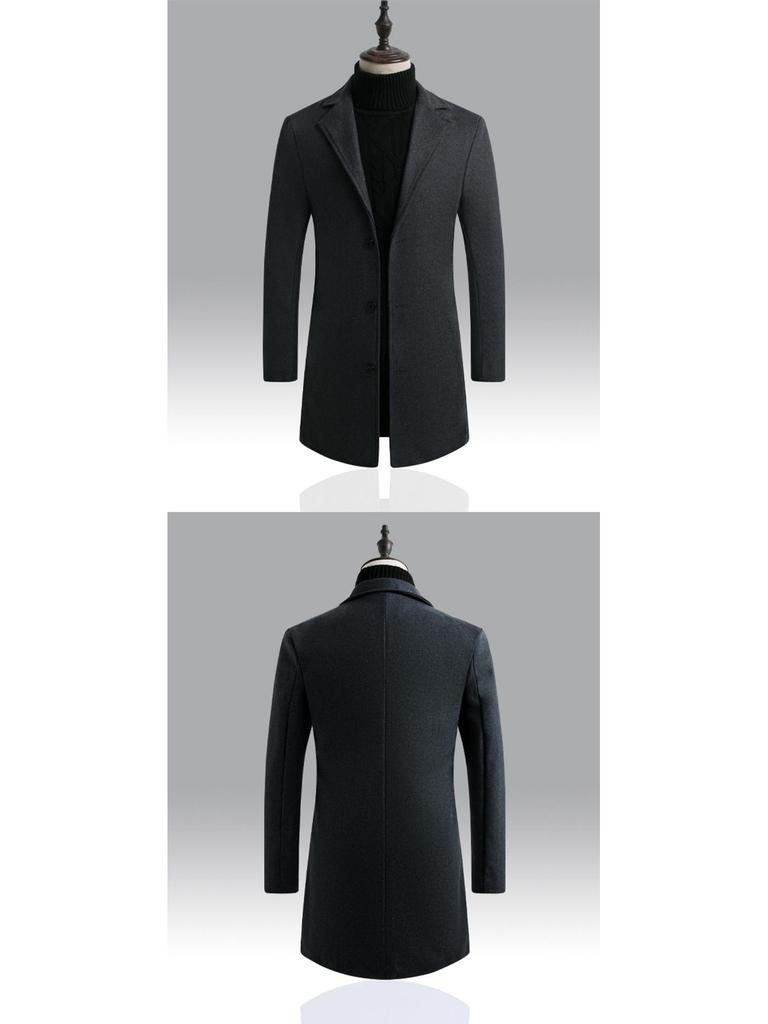 Этот стильный мужской приталенный шерстяной тренч — идеальная верхняя одежда для осени и зимы.. Разработанный со стандартной посадкой, он обеспечивает как комфорт, так и элегантный внешний вид.. Пальто отличается утепленной толщиной, обеспечивающей тепло в прохладные дни. Изготовлен из полиэстера, он прочный и легкий. Мех из смесового химического волокна добавляет нотку изысканности, а воротник пиджачного типа обеспечивает изысканный и классический вид.. Благодаря своему однотонному узору это пальто универсально и подходит для различных случаев.. Идеально для тех, кто ценит моду в корейском стиле, он органично сочетает функциональность с современным стилем.