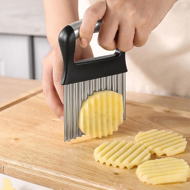 2. Острый фигурный нож:Нож для нарезки картофеля фри имеет прочное и острое лезвие, которое легко и быстро режет овощи, придавая картофелю, фруктам и овощам ровную и красиво волнистую форму, которая выглядит изящно и красиво.
