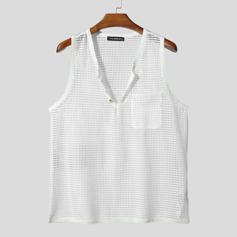 INCERUN Мужские майки без рукавов с V-образным вырезом, из прозрачной сетки с вырезами, для вечеринок и пляжа