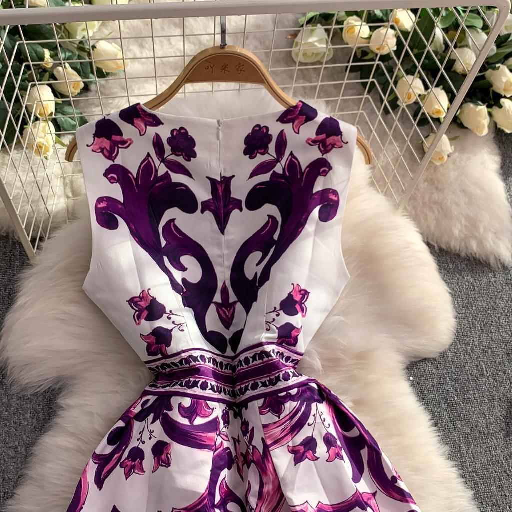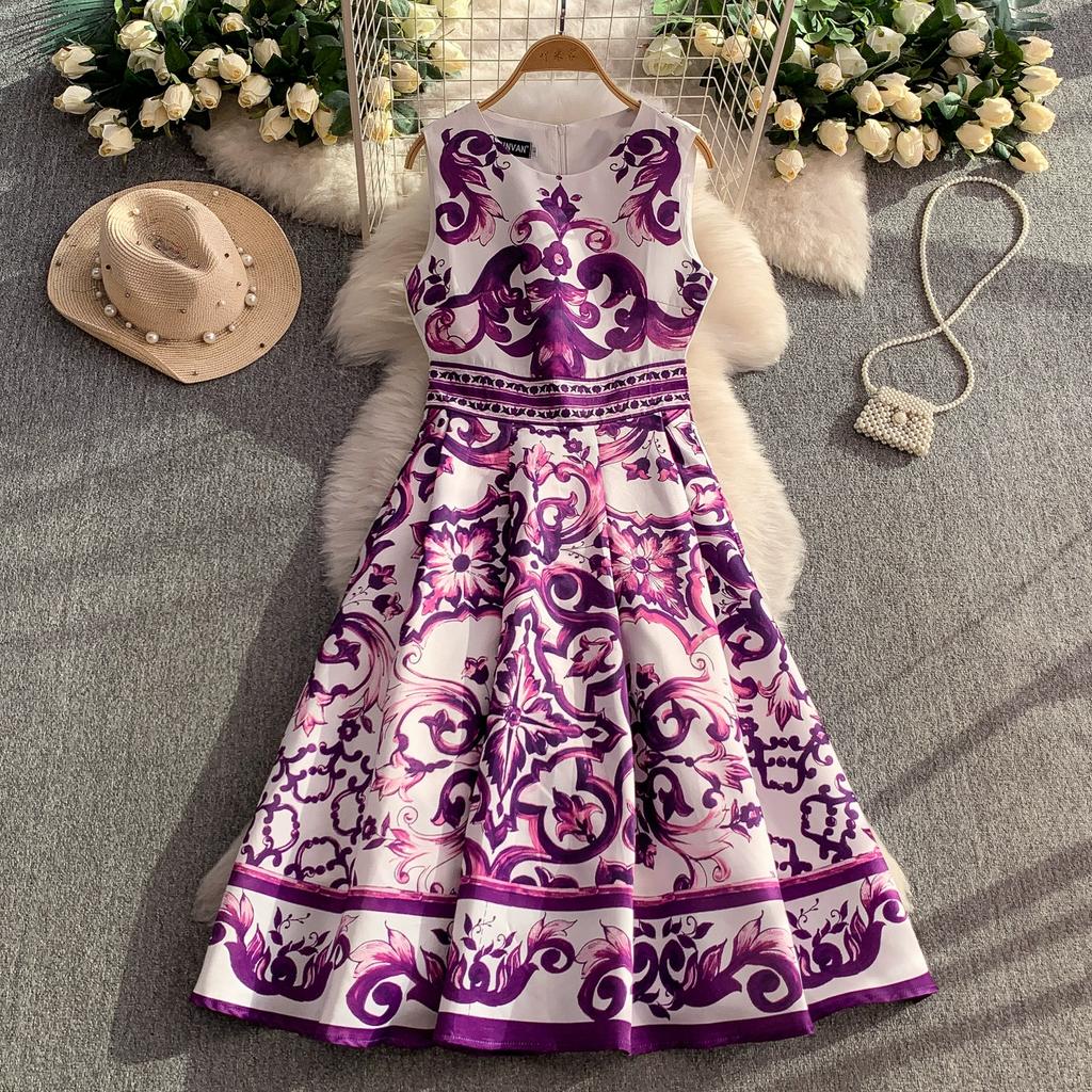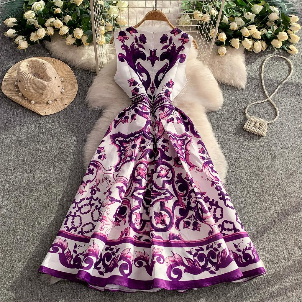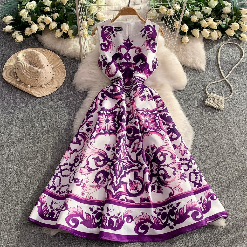 Летнее винтажное дизайнерское платье с принтом, сине-белый фарфор, подиумное, женская мода, без рукавов, майка, миди, вечерние платья