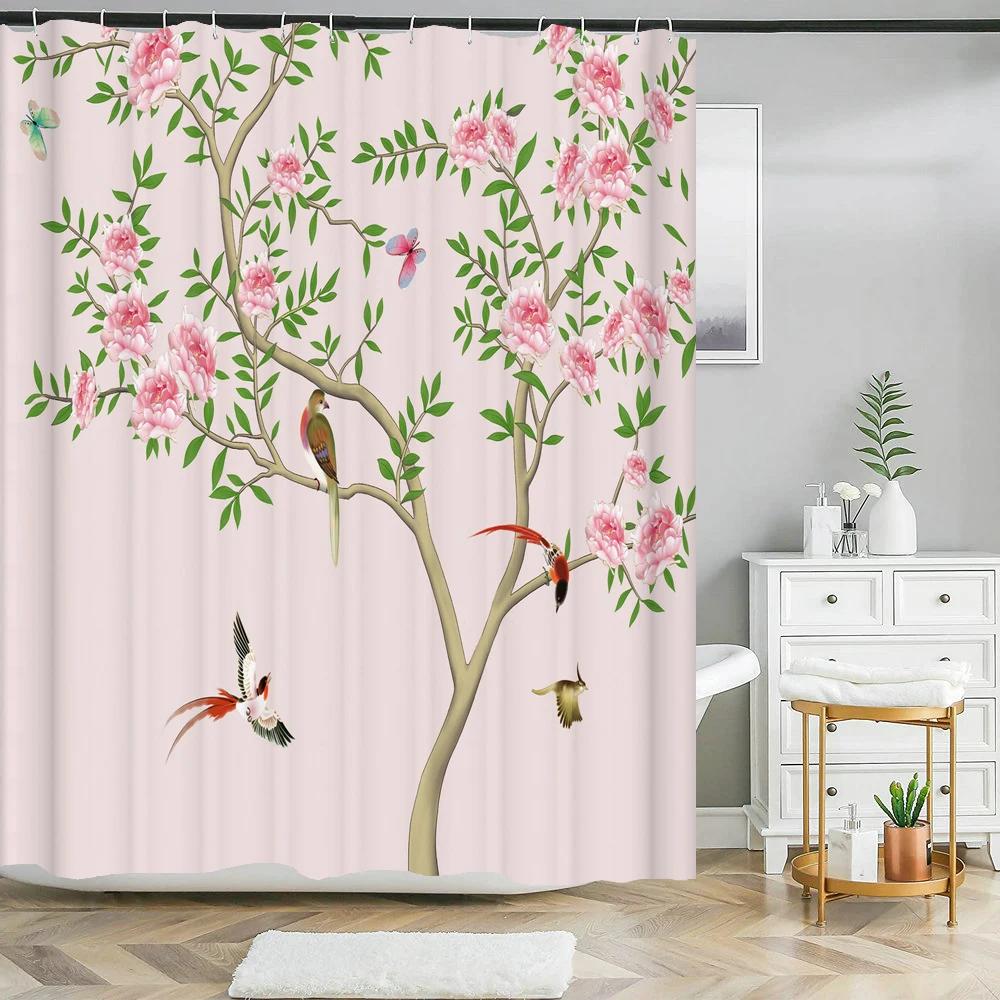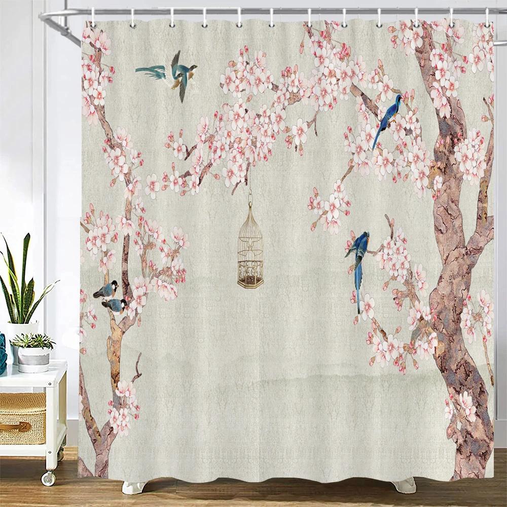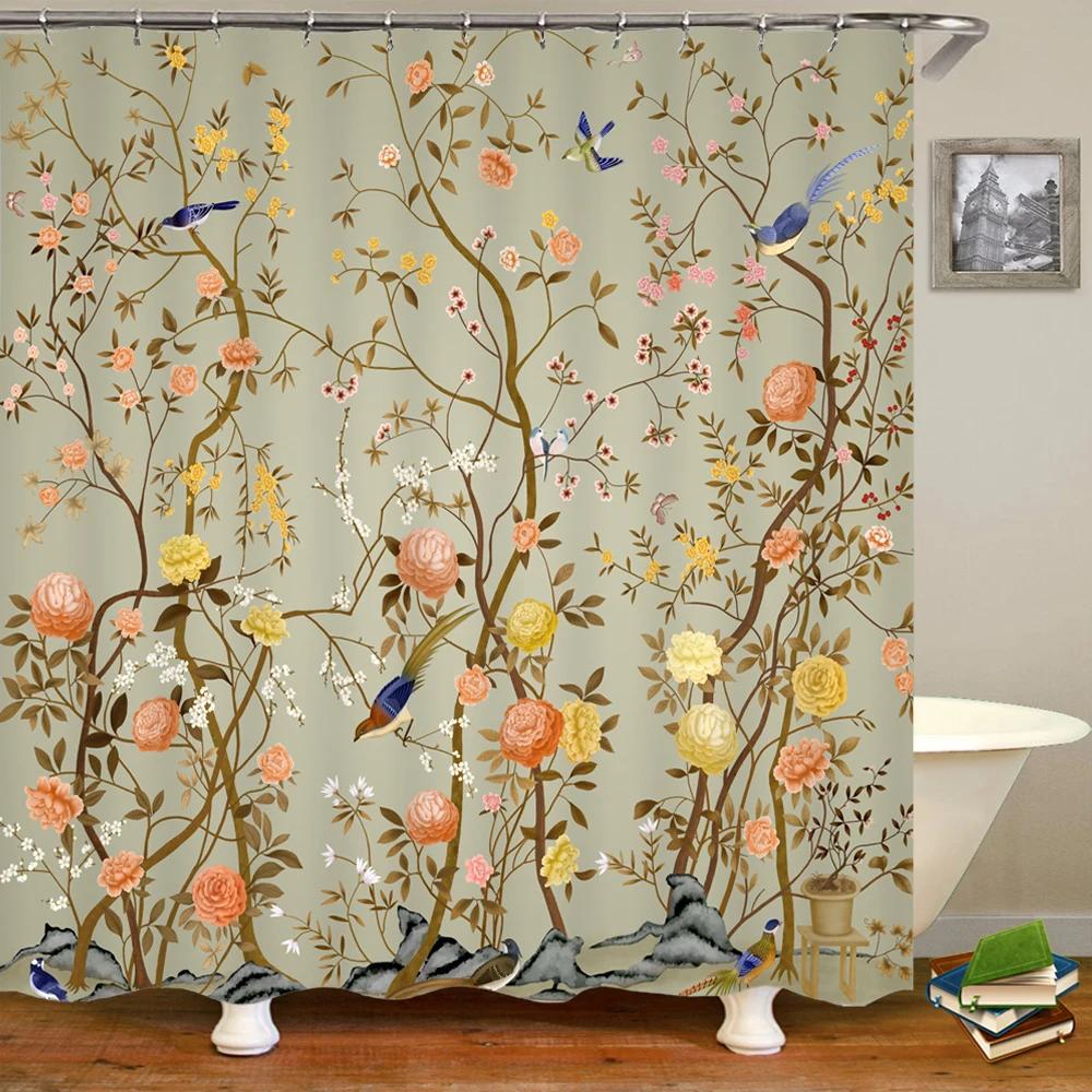 Занавеска для душа в китайском стиле с цветком и птицей, водонепроницаемая занавеска для ванной комнаты, ткань с 3d принтом и крючками, декоративная занавеска для душа