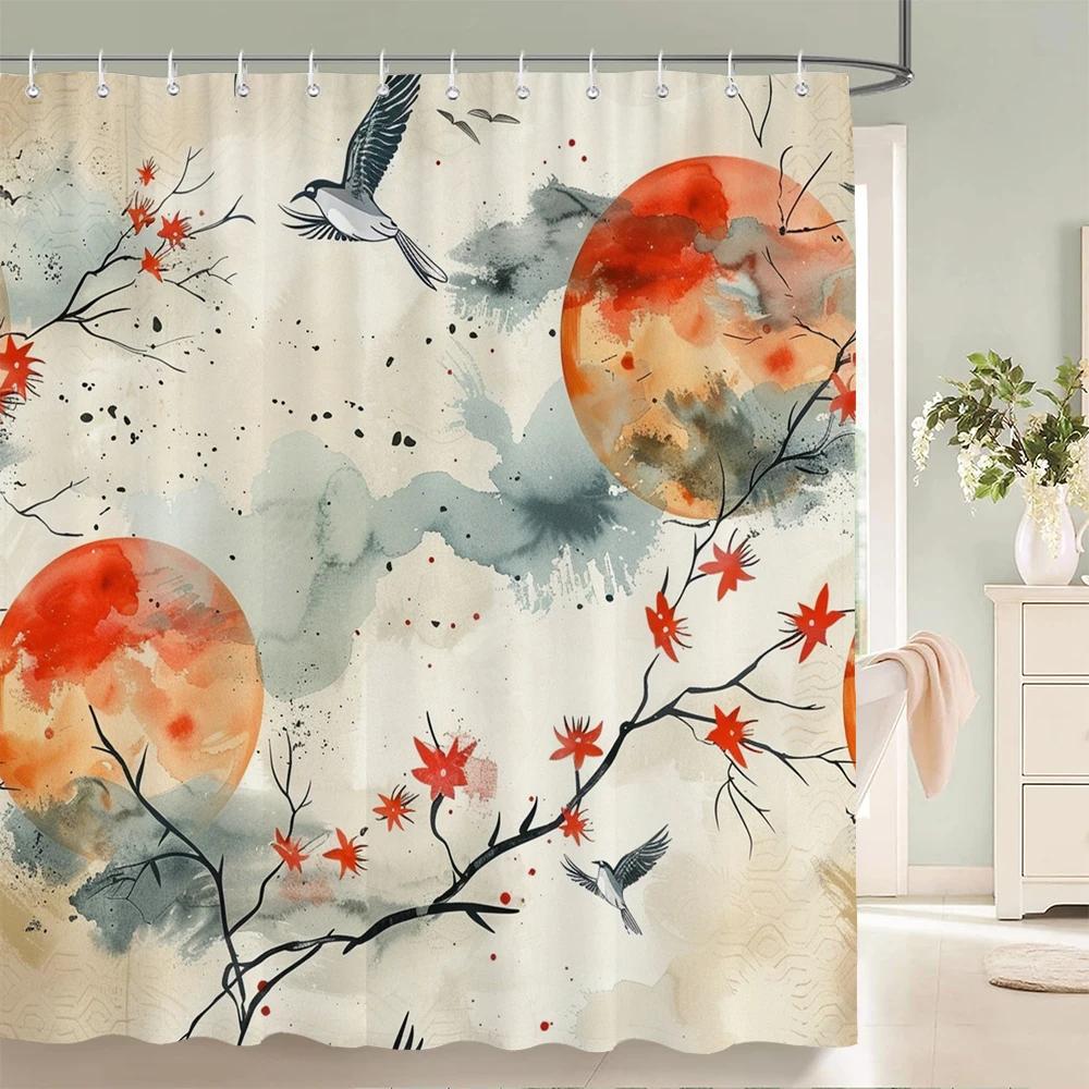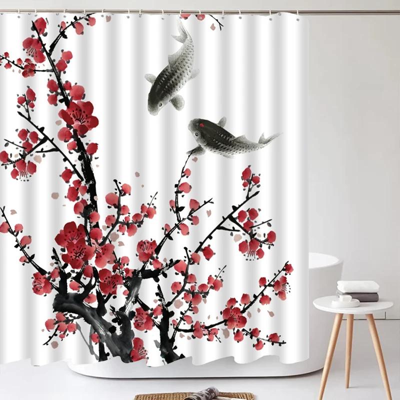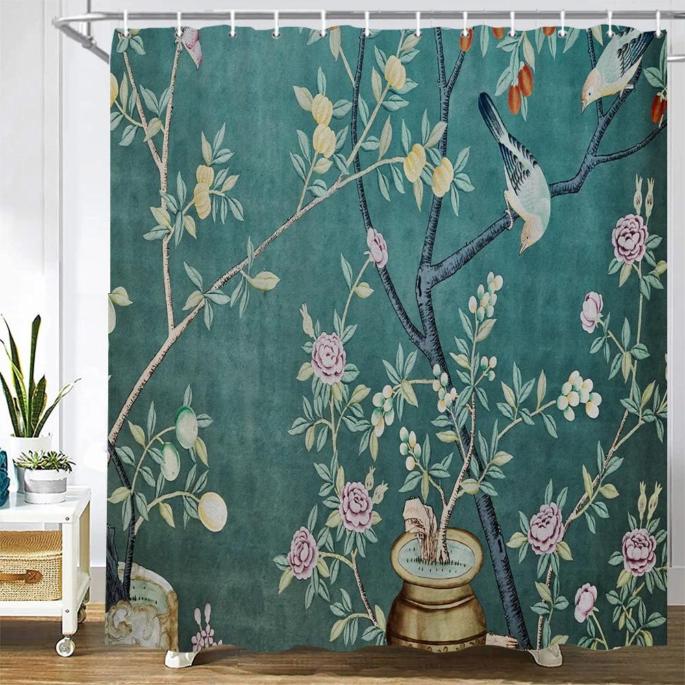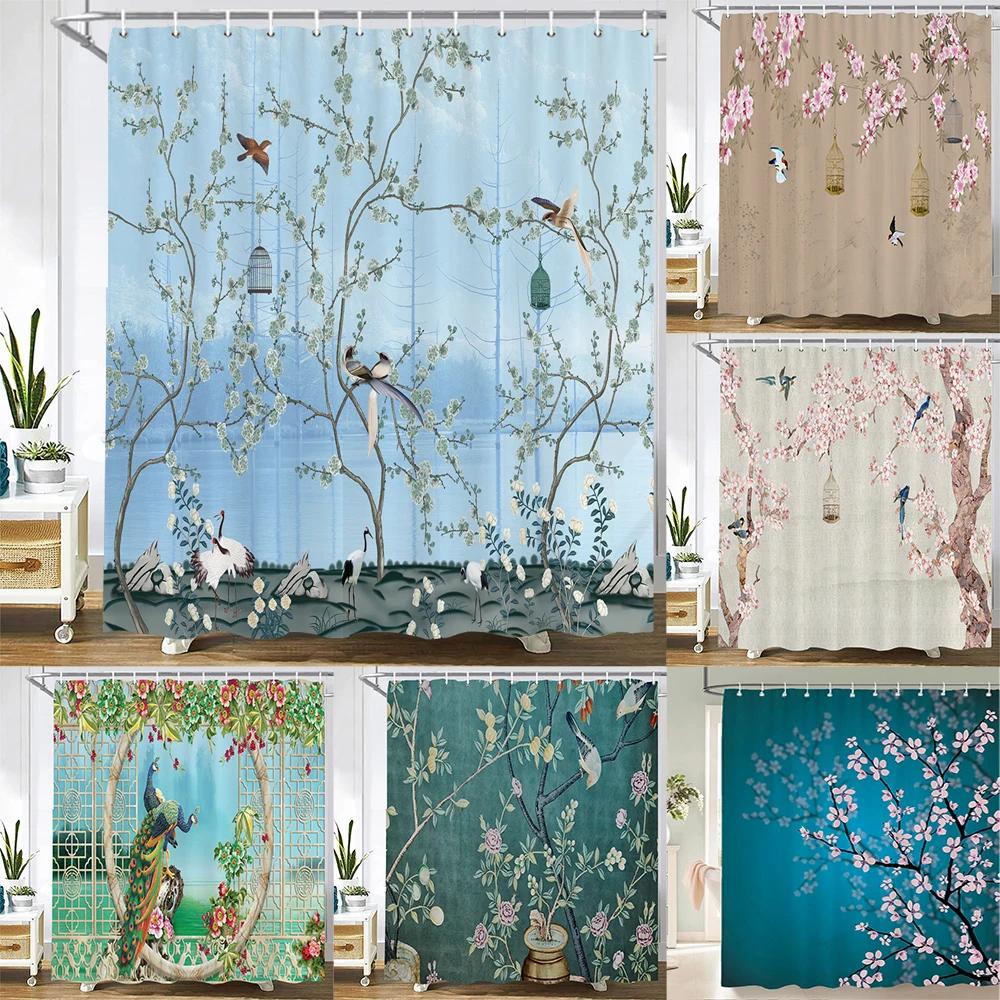 Занавеска для душа в китайском стиле с цветком и птицей, водонепроницаемая занавеска для ванной комнаты, ткань с 3d принтом и крючками, декоративная занавеска для душа