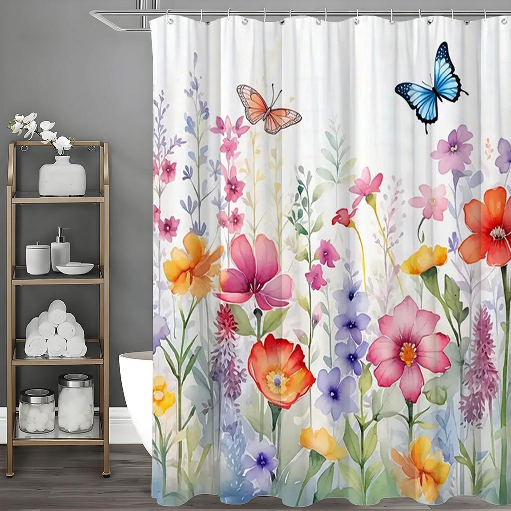 Цветочная шторка для душа Цветок Бабочка Цветущая Весна Акварель Натуральная Ботаническая Шторка для душа, Водонепроницаемая с крючками