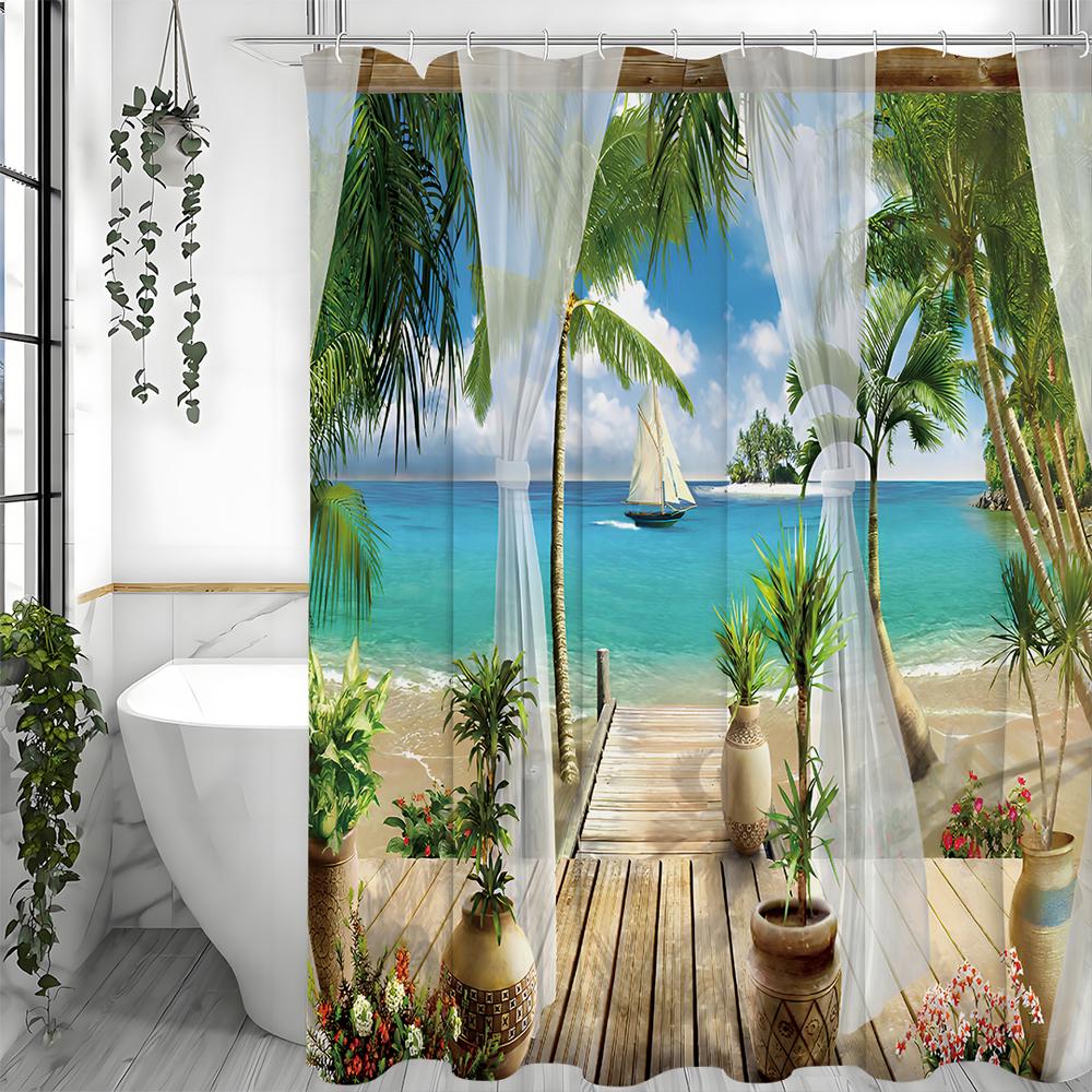 Балкон Пляж Вид на море Занавеска для душа, Цветочный Океан Пальма Парусник Ванная комната Декоративная Занавеска для душа, Водонепроницаемая Занавеска для душа