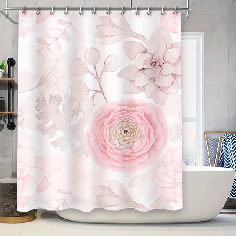 Нежная розовая цветочная шторка для душа Декоративный акварельный принт для ванной комнаты Полиэстеровая ткань с кольцами Доступны различные размеры