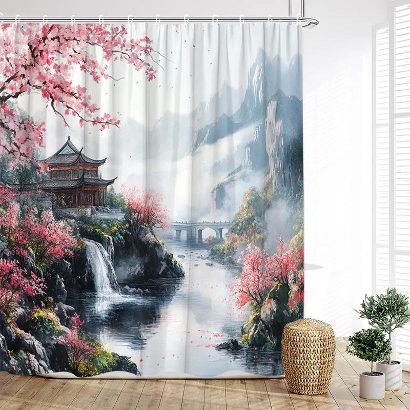 Пейзажная шторка для душа в японском стиле, тушь, гора, цветение сакуры, павильон, озеро, азиатское искусство, занавески для ванной, домашний декор для ванной