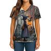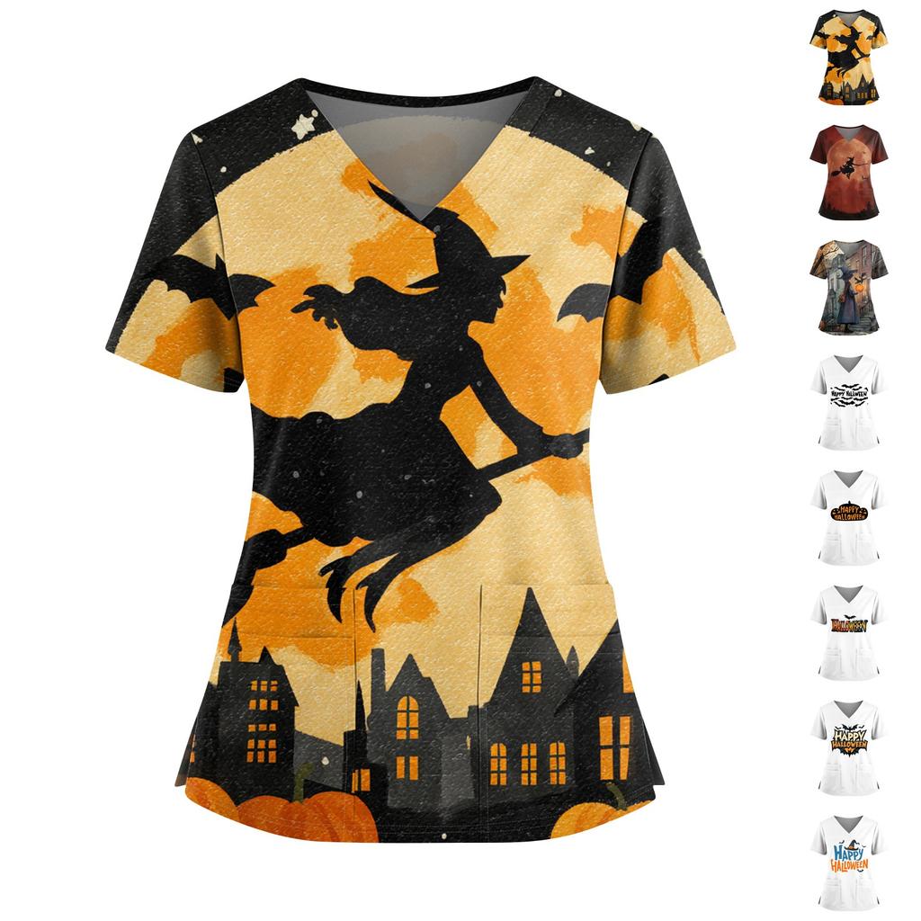 Женский Хэллоуинский Принт V-образный вырез Двойной карман Короткий рукав Разрез по подолу Топ для униформы/сиделки
