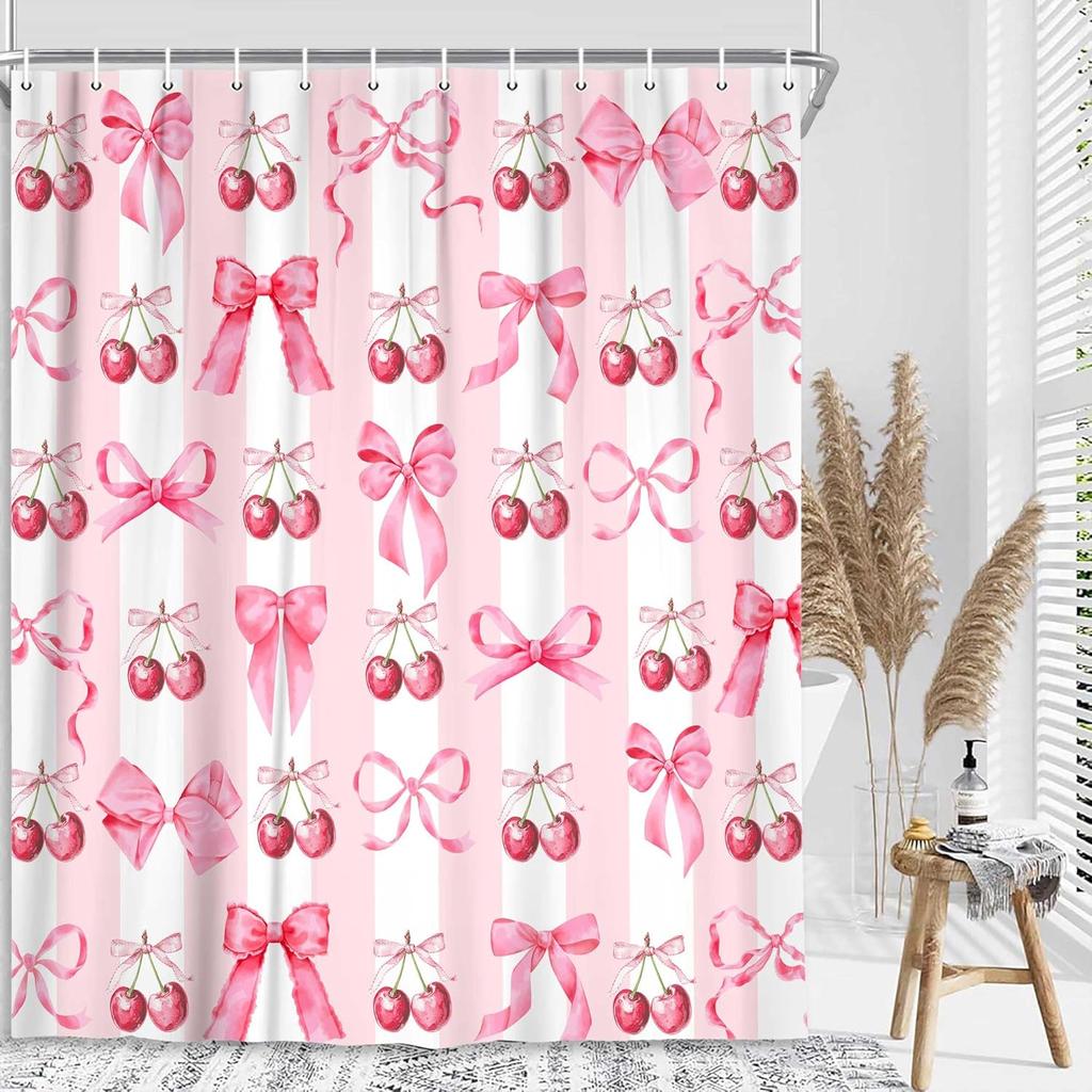 Pink Fruit Shower Curtain, Red Cherry Bow Aesthetic Watercolor Bathroom Curtain,Bowknot Princess Curtain Waterproof Polyester Washable with 12