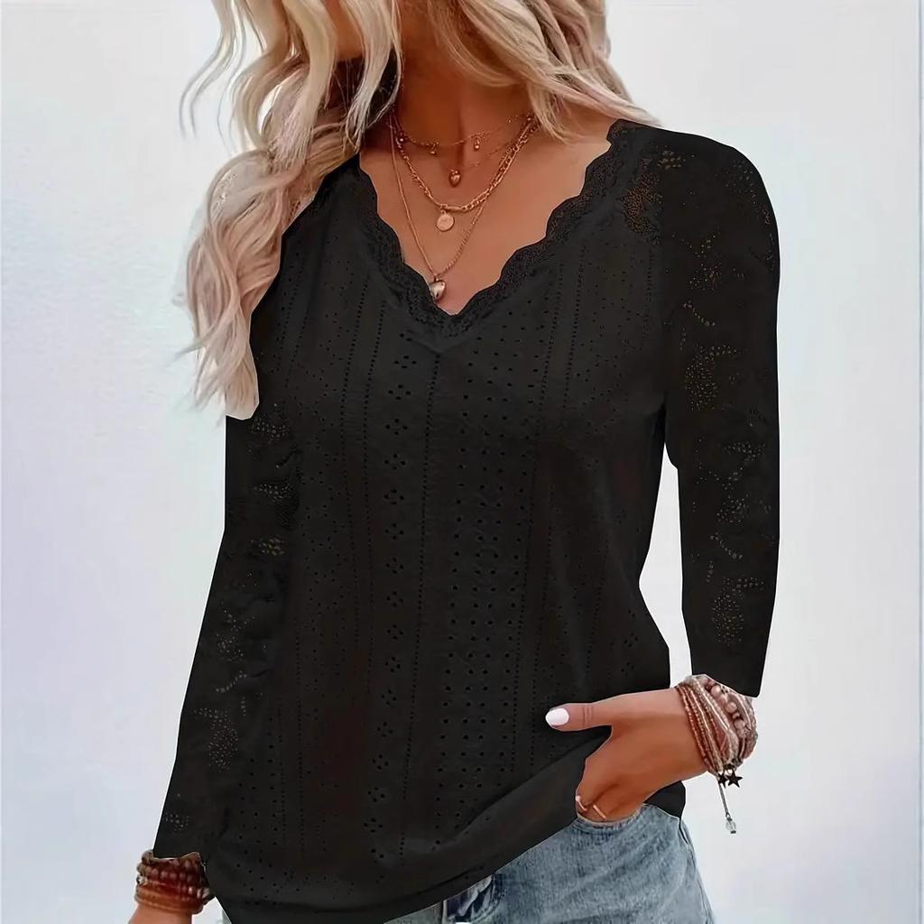 Весенне-осенний топ с длинным рукавом, кружевной вставкой и ажурным узором, модные женские футболки