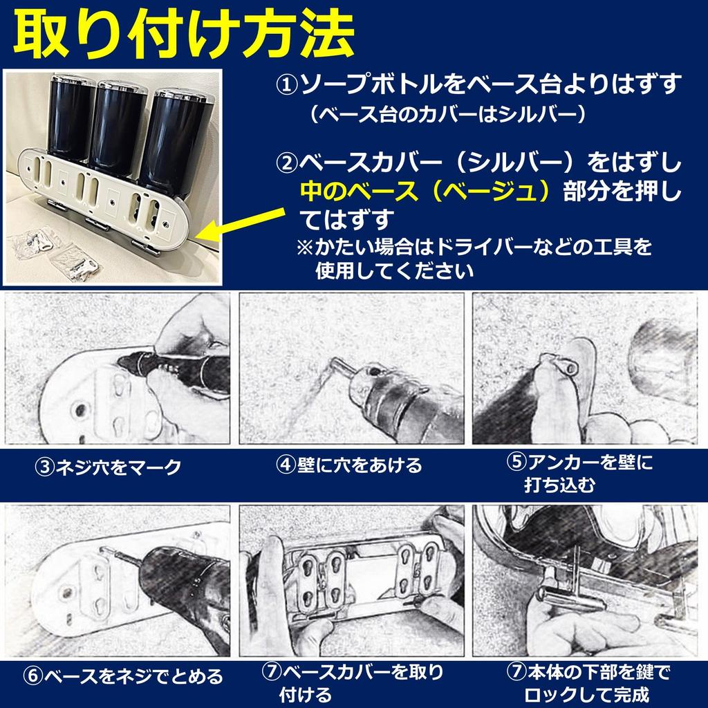 [Как установить] (1) Снимите бутылочку с мылом с крышки основания. (Серебряный). Он заперт, поэтому используйте прилагаемый ключ, чтобы разблокировать его.. (2) Снимите крышку основания и надавите на основание (бежевый) внутри, чтобы удалить его. *Если его трудно снять, используйте инструмент для его снятия. (3) Прикрепите снятое основание к стене с помощью шурупов.. *Для этого требуется сверление отверстий в стене. (4) Прикрепите нижнюю крышку, снятую в (2). (4) Прикрепите бутылку с мылом и готово.