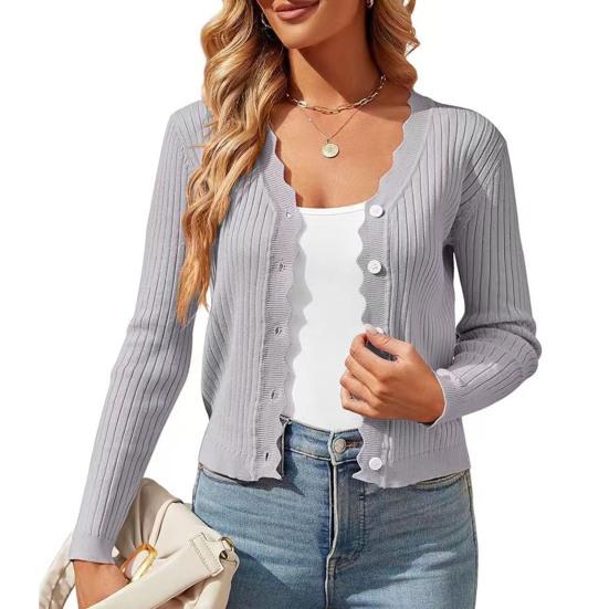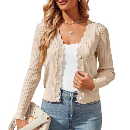 Элегантный дизайн с V-образным вырезом: Подчеркните свой стиль изысканным V-образным вырезом этого кардигана. Силуэт с длинными рукавами украшен пуговицами, что без особых усилий добавляет изысканности вашему наряду.