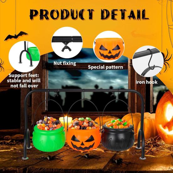 В набор входят три ведьминских котла, железная подставка, крючки и скелеты для полного Хэллоуинского опыта.. Идеально подходит для украшения комнат, домов с привидениями и вечеринок, это универсальное изделие можно использовать в помещении или на улице..