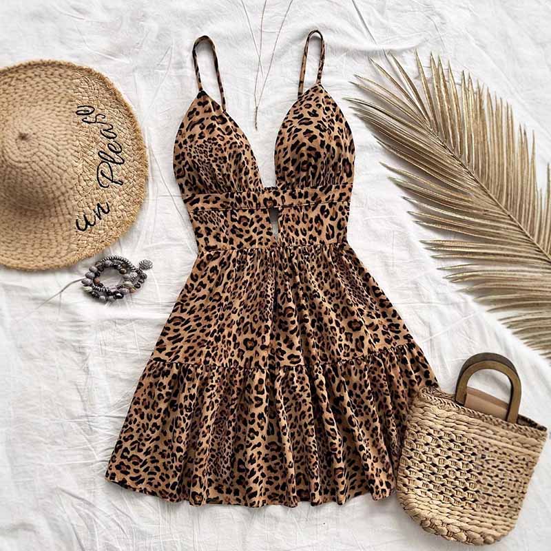 Летнее платье-халтер Леопардовое Сексуальное С открытой спиной Для отпуска На море Пляжное Платья с вырезами