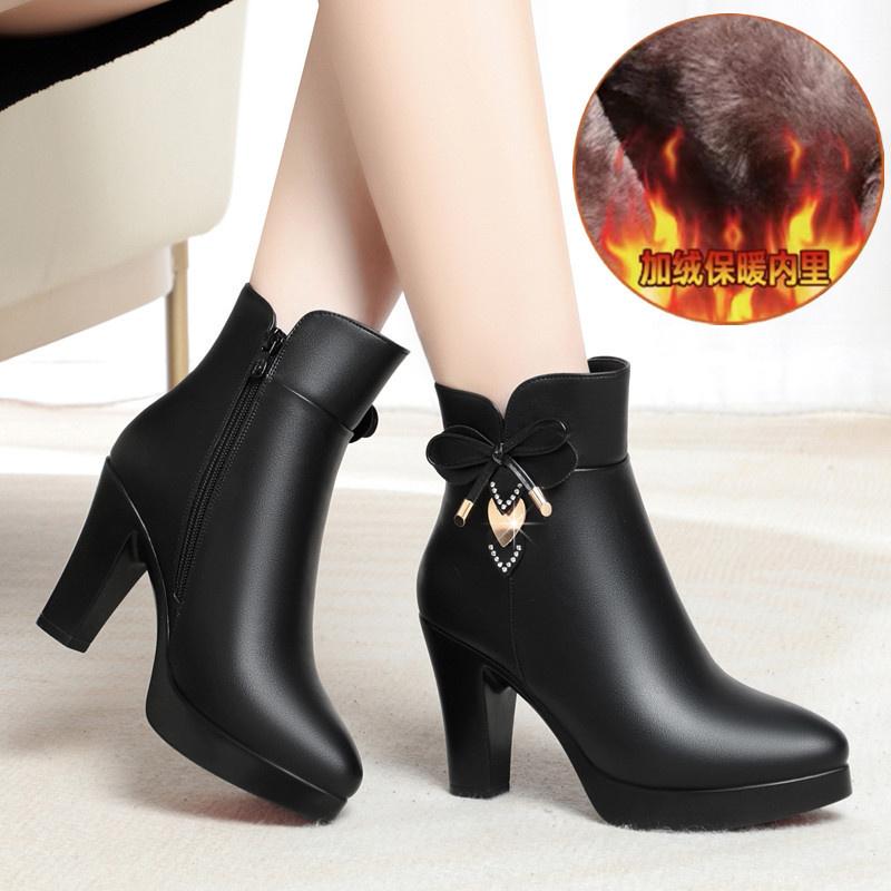 Женские зимние ботильоны с острым носком на водонепроницаемой платформе для студентов, короткие ботинки на толстом каблуке для молодых мам из хлопка с противоскользящим покрытием