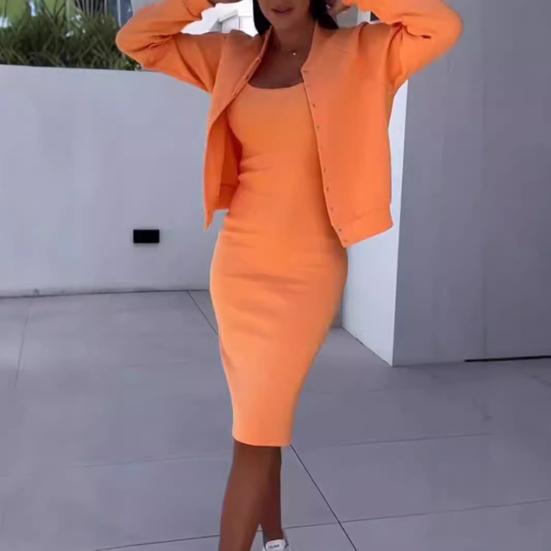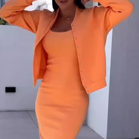 Универсальный длинный костюм: Украсьте свой гардероб этим элегантным и универсальным длинным костюмом, подходящим как для повседневного ношения, так и для поездок на работу.. Комплект из двух предметов — топа с длинными рукавами и платья с подвязками — излучает изысканность и очарование.