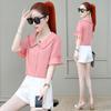 Офис Леди Шик Блузка с Воротником Питер Пэн, Вышитые Расклешенные Рукава, Летняя Однотонная, Универсальная, На Кулиске, Женская Рубашка с Короткими Рукавами