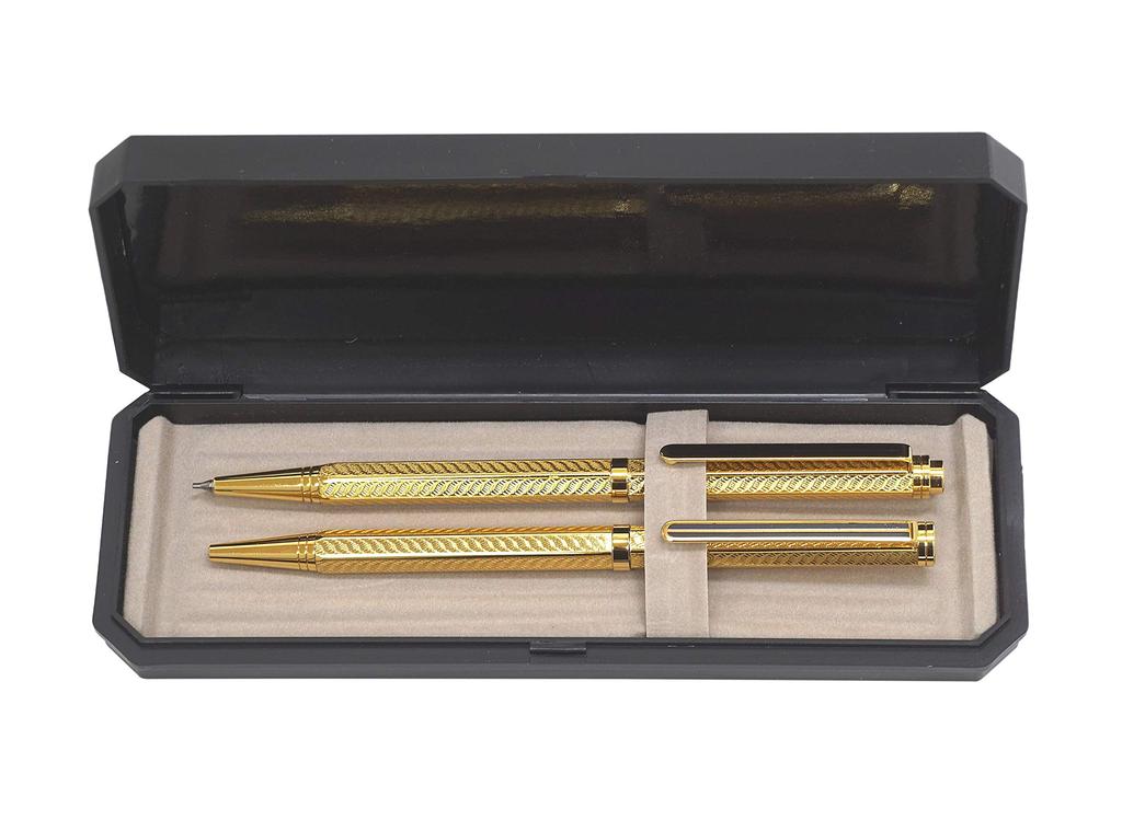 Takizawa Brass Hexagonal Rotating Horikin Ballpoint Pen and Mechanical Pencil Set in a Luxury Includes a Brass Engraved Rotating Ballpoint Pen and a