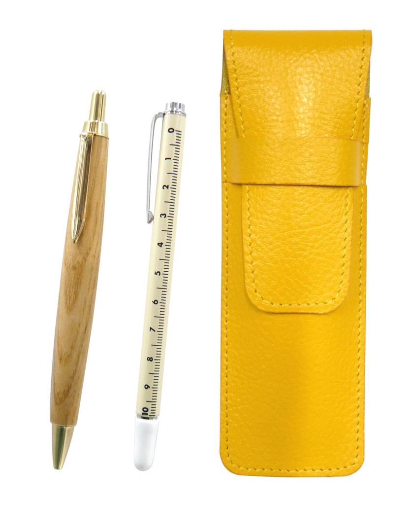 Yellow Grained Leather Pencil Case with Slide Measuring Stick and Retro Maple Ballpoint Pen Set Two-Pack (SASY-708W-HS47S-2)