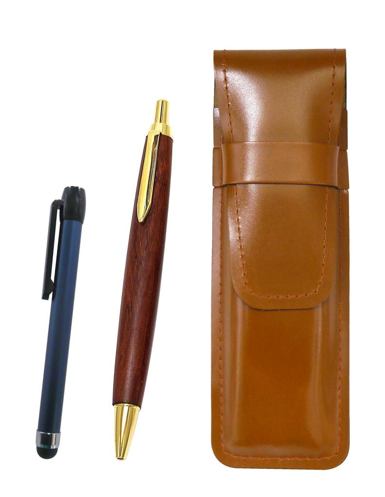 slim cowhide leather pencil case brown with blue metal touch stick and brown wooden barrel retro ballpoint pen set 2-pack ASC-ALL-HS48S-2