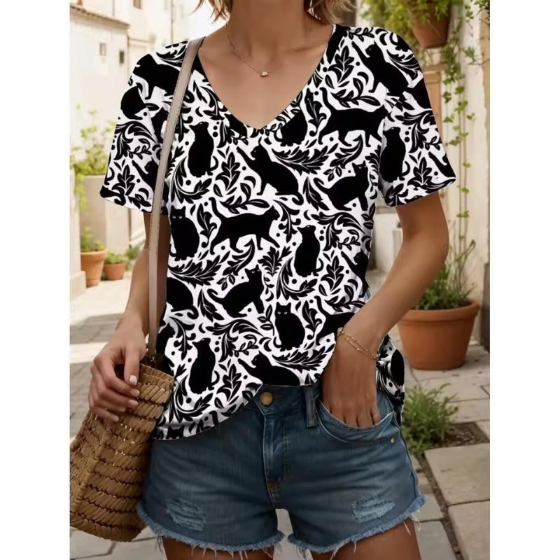 Женская футболка Kawaii с графикой кота Модная с коротким рукавом V-образный вырез Обычные топы Повседневная футболка с 3D-принтом Лето Весна Повседневные топы