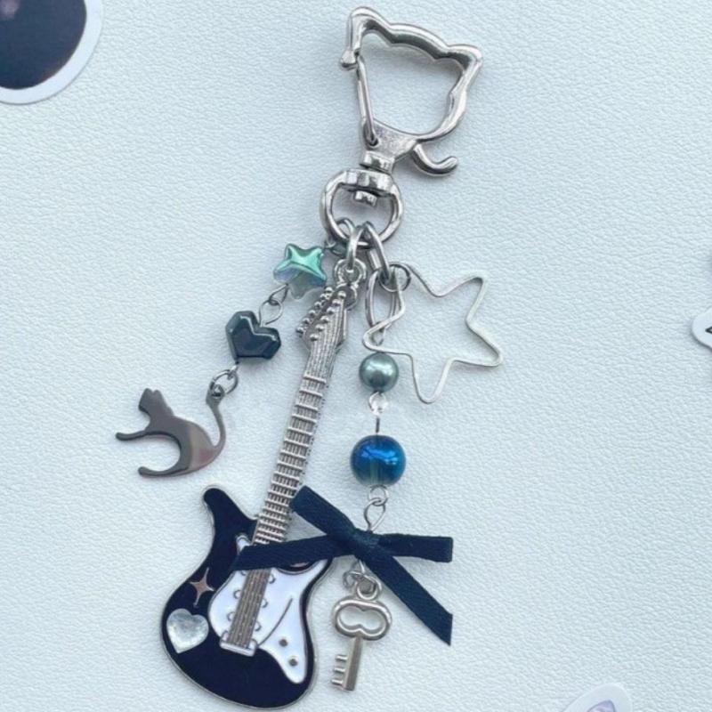 Брелок для ключей Y2K Гитара Кот для мужчин женщин Пентаграмма Бант Подвеска Мода Рок Панк Аксессуары для сумки Подарок
