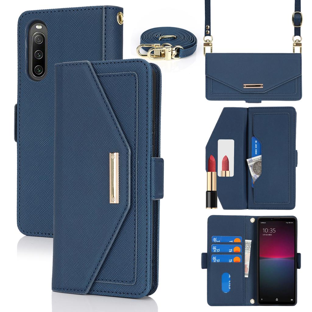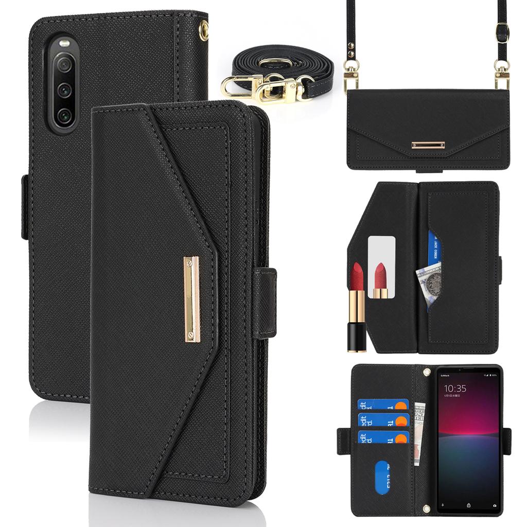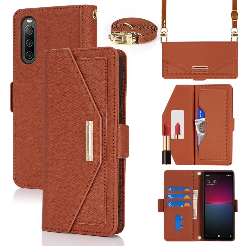 Чехол-подставка для Sony Xperia 10 IV 5G, кошелек из искусственной кожи с текстурой крест-накрест, чехол для телефона с плечевым ремнем/зеркальцем для макияжа