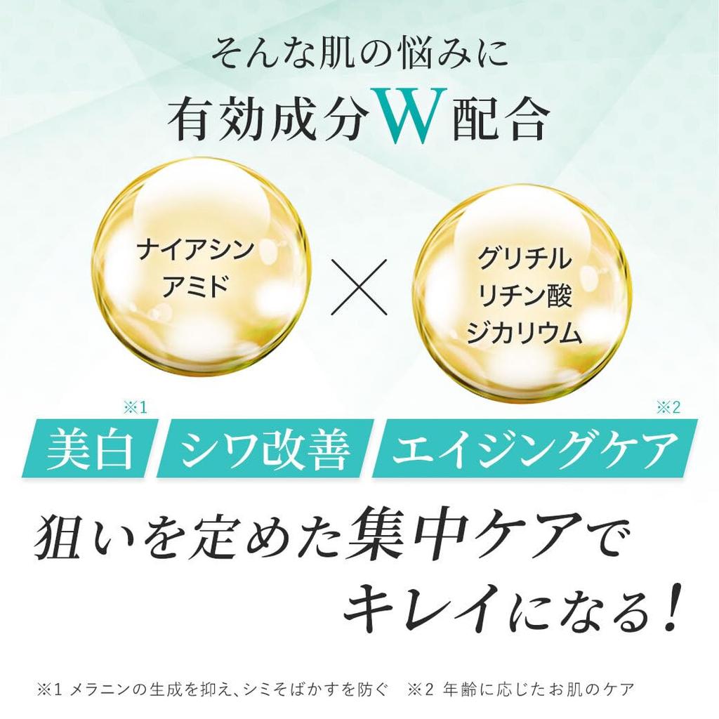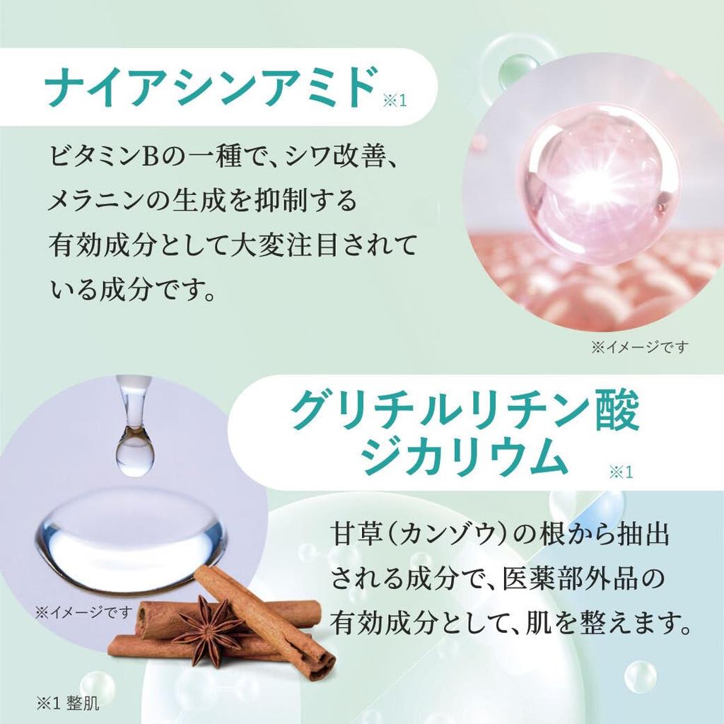 [Квазилекарственное средство для уменьшения морщин и отбеливания*1] Активными ингредиентами являются ниацинамид и дикалия глицирризинат, и эффективность этого косметического продукта признана в "уменьшении морщин и отбеливании**1." Этот нелипкий, легко распределяемый крем сохраняет вашу кожу увлажненной. *1 Подавляет выработку меланина и предотвращает появление пятен и веснушек.