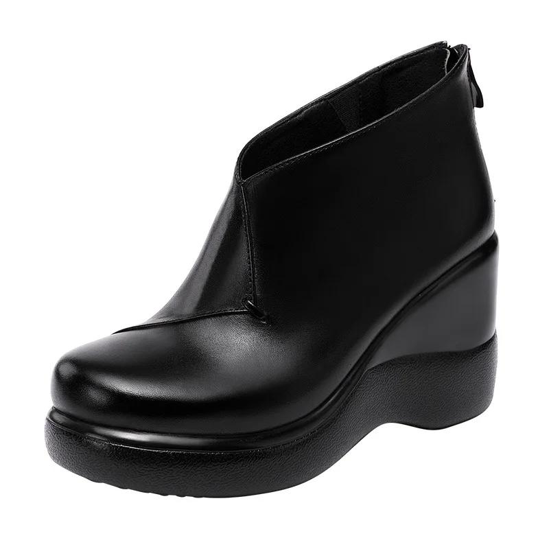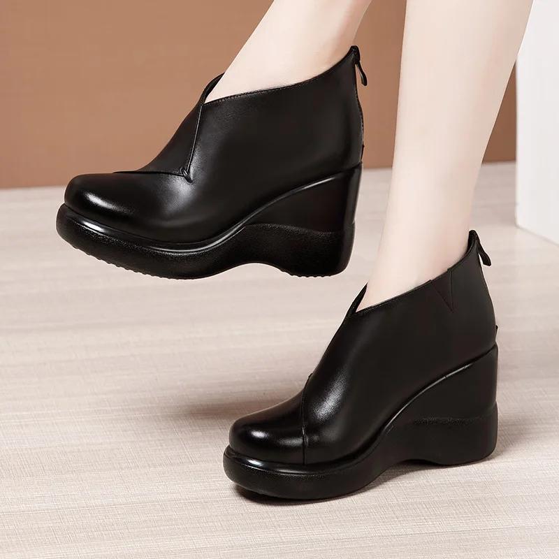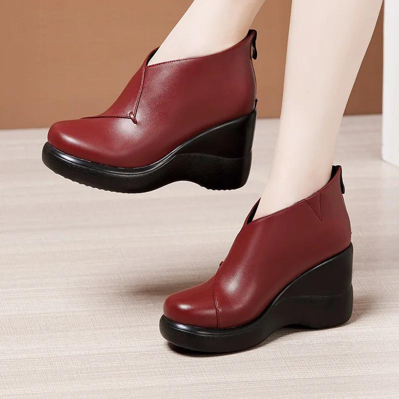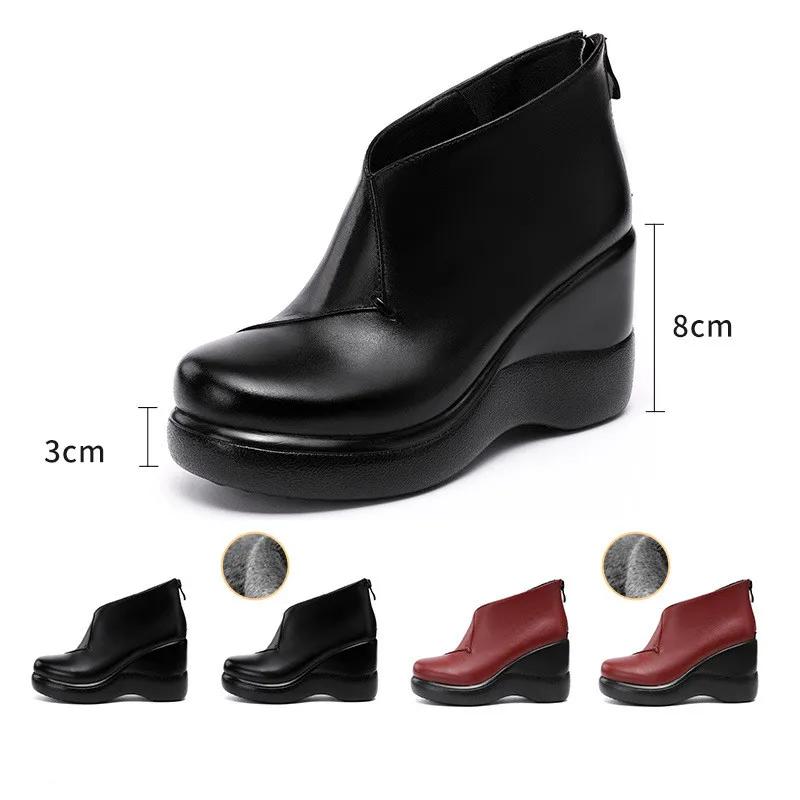 Маленький размер 32-43 Качественная обувь из мягкой кожи Женские туфли на платформе и танкетке Осень Зима 2025 Теплые плюшевые туфли на высоком каблуке Ботильоны для мамы