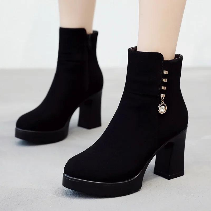 Большой размер 33-43 Качественные ботильоны на высоком блочном каблуке из искусственной замши черного цвета Зимняя обувь Женская 2025 Толстая платформа До щиколотки Ботильоны для офиса