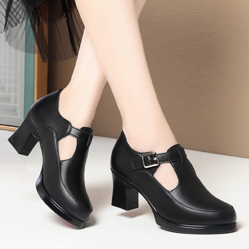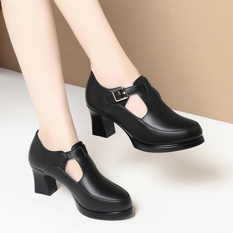 6 см Дышащие Удобные Т-образные Туфли из Мягкой Кожи Женские Туфли-Лодочки Весна 2025 Средний Блочный Каблук Обувь для Офисной Работы Танцев Мама
