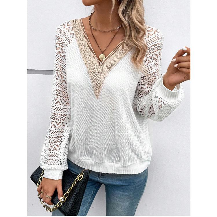 Осенний кружевной топ на шнуровке с вырезами и прозрачными вставками, повседневная женская футболка с V-образным вырезом и длинными рукавами