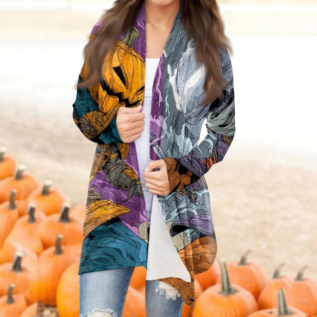 Женская модная повседневная куртка-кардиган средней длины с принтом на Хэллоуин и нерегулярным подолом