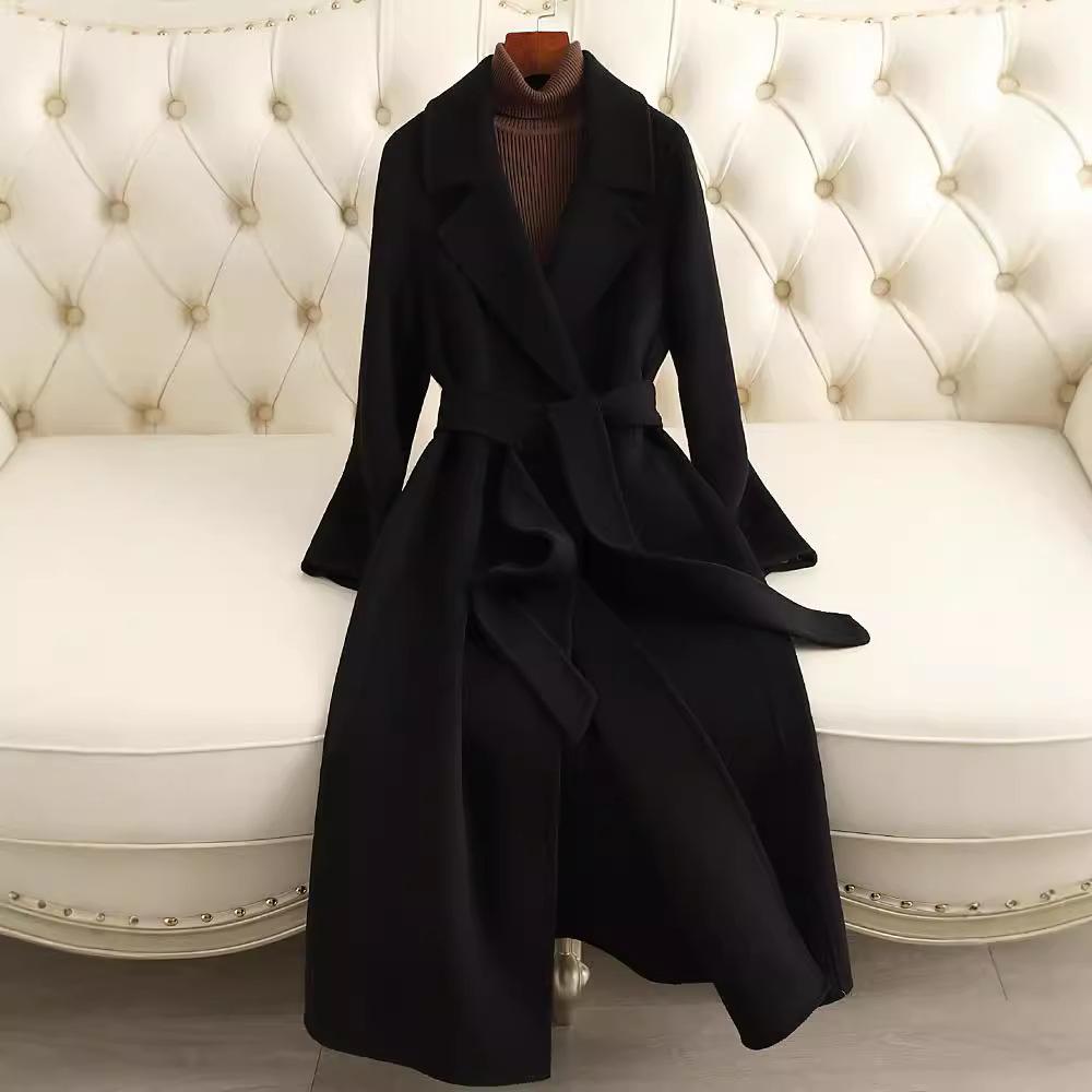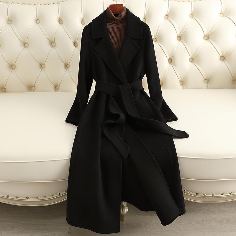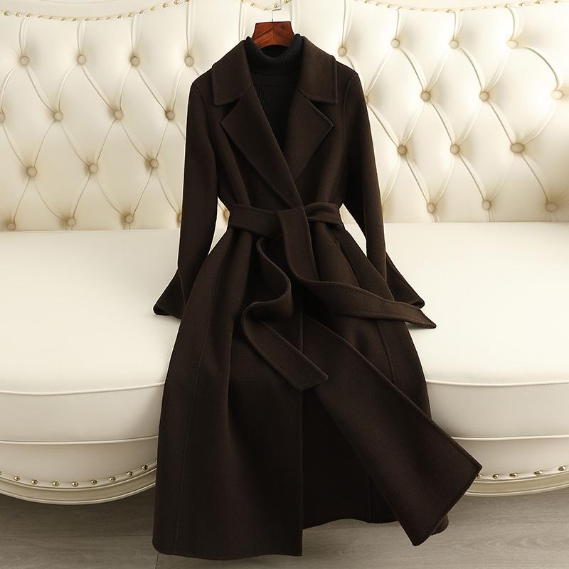 Двустороннее кашемировое пальто женское средней длины новое осенне-зимнее приталенное до колена шерстяное пальто с плечиками