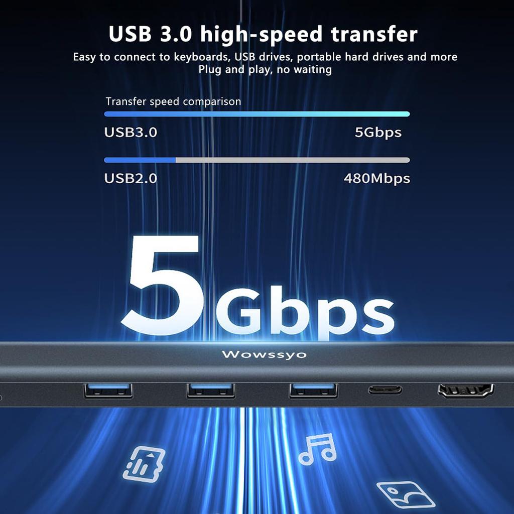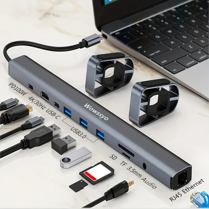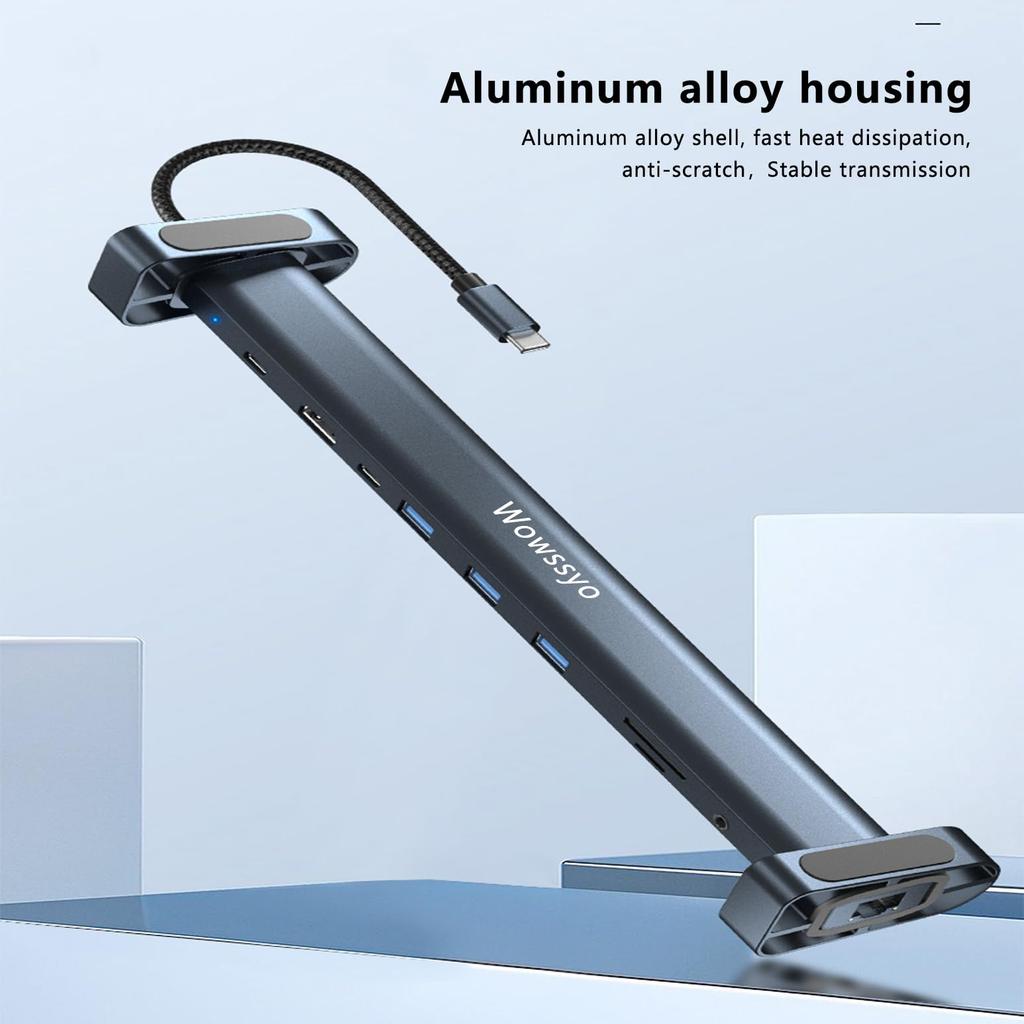 Съемный USB-концентратор C Wowssyo 10-в-1 с док-станцией USB C, Ethernet LAN RJ45, 100 Вт PD, USB-A 5 Гбит/с x 3, порт TF/SD, аудио, порт данных USB-C, 4K HDMI, для MacBook M1, iPad Pro, Surface Pro и т. д.