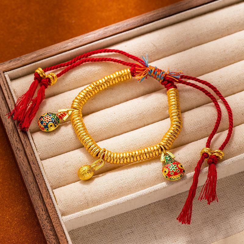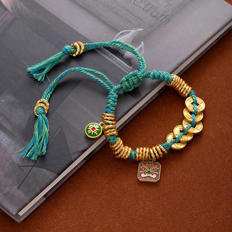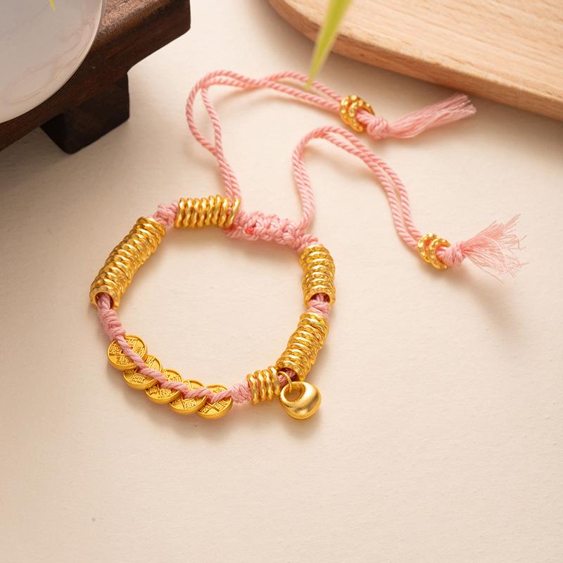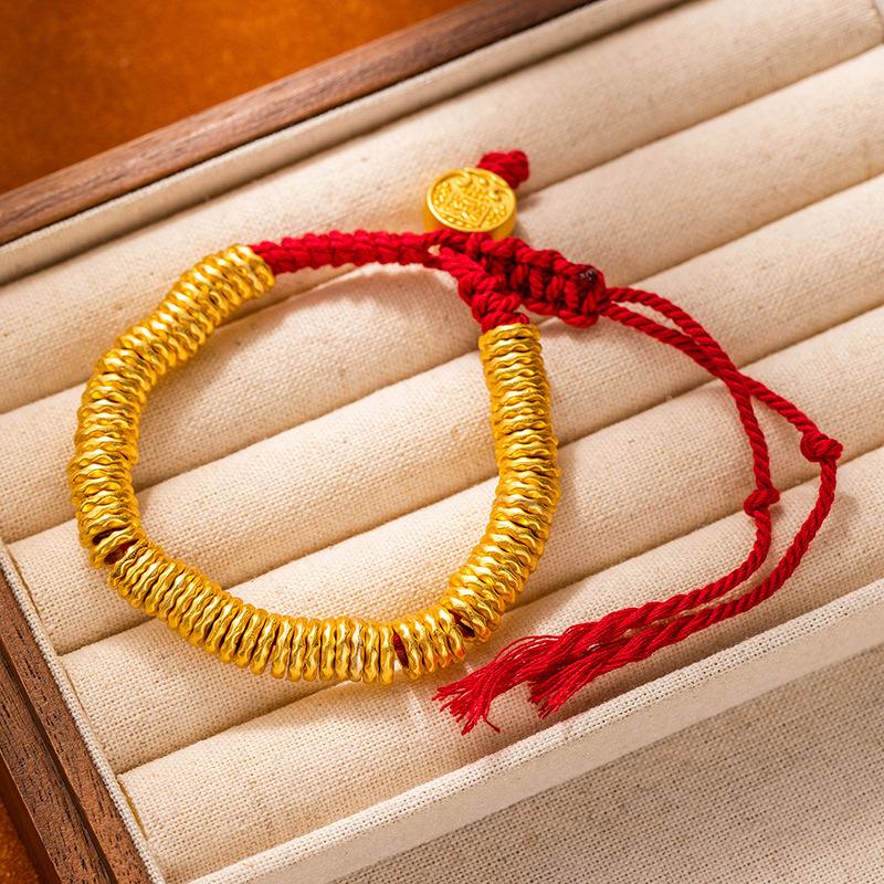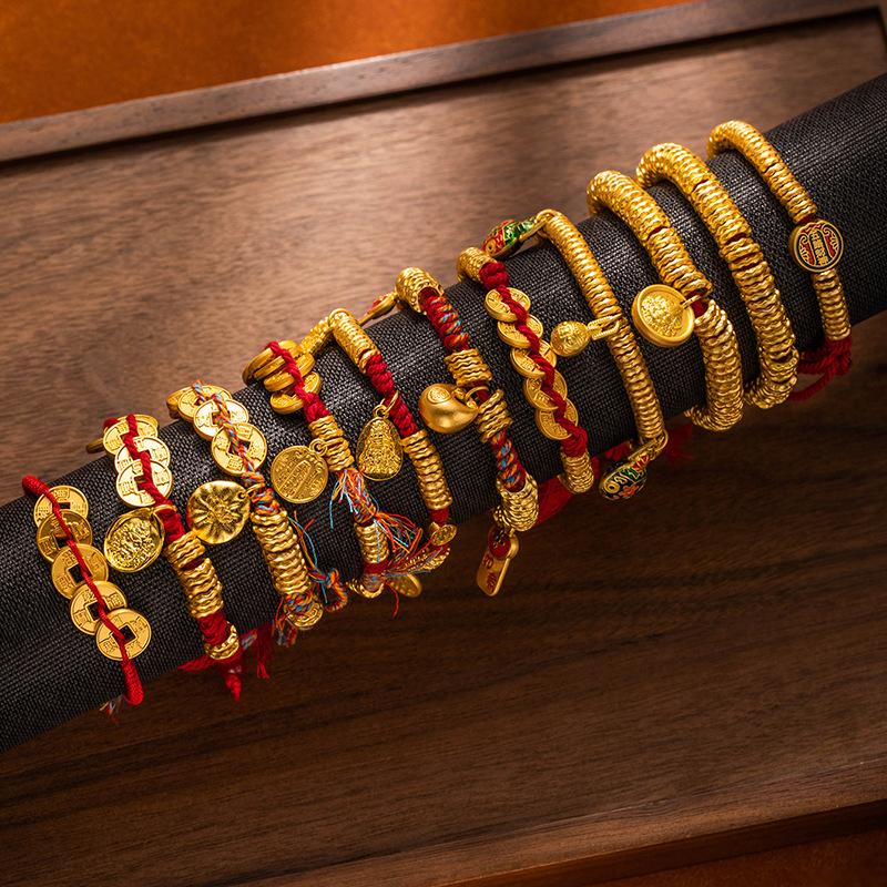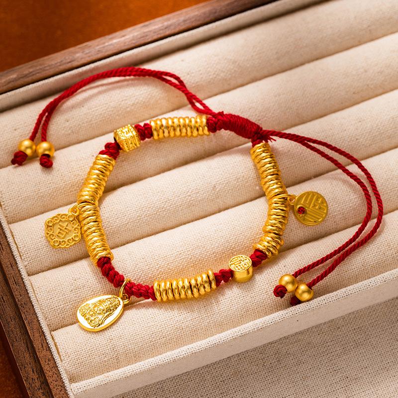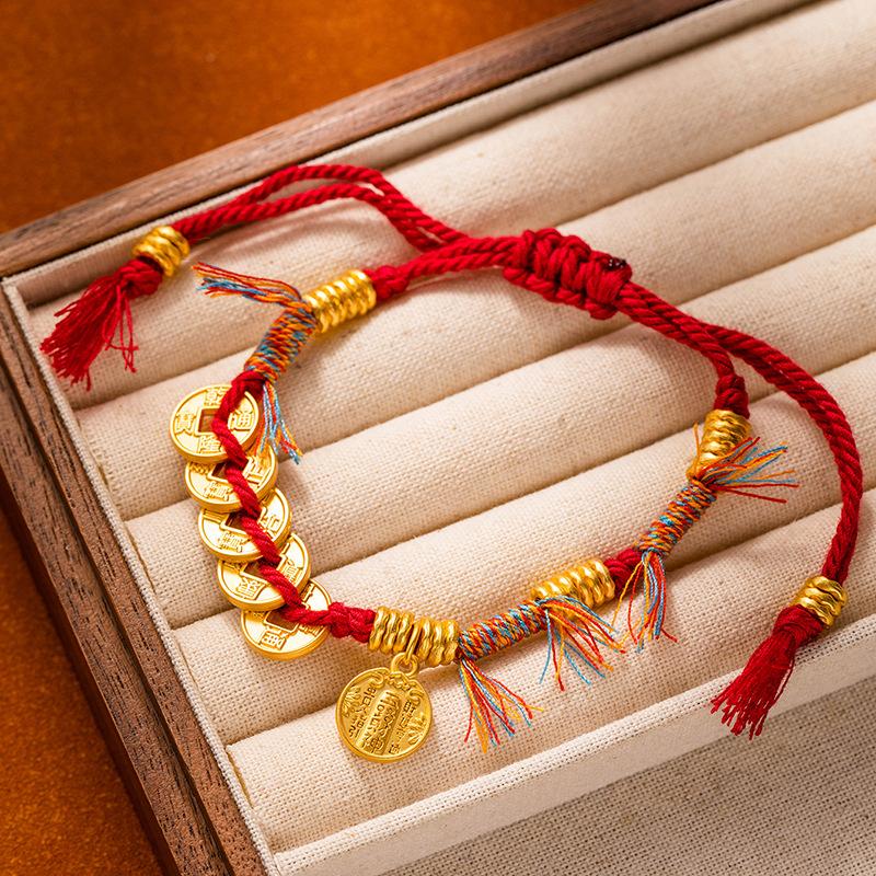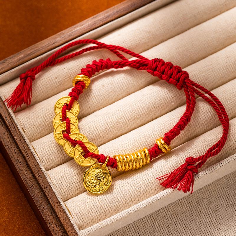 Браслет из песочного золота в древнем стиле, браслет с красной нитью с круглым знаком Бога богатства для мужчин и женщин, браслет для богатства и силы
