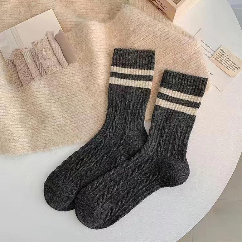 Простые полосатые гольфы до бедра в студенческом стиле с двумя полосками, утолщенные носки, женские носки до середины икры для ношения со сноубутсами и стопка женских носков