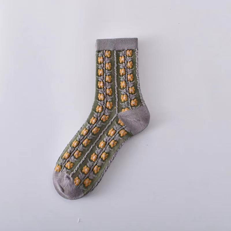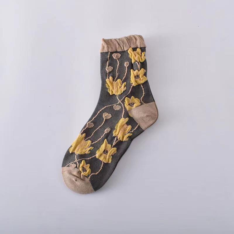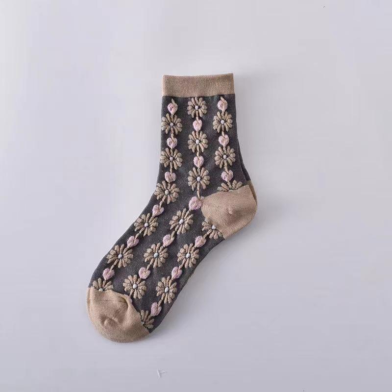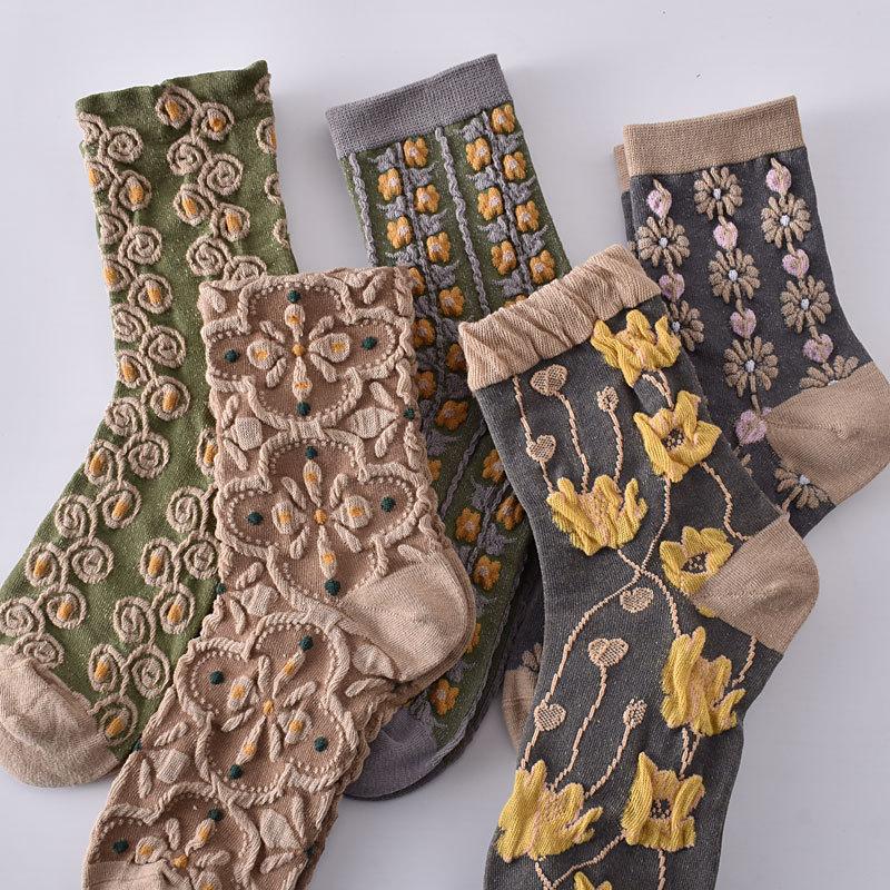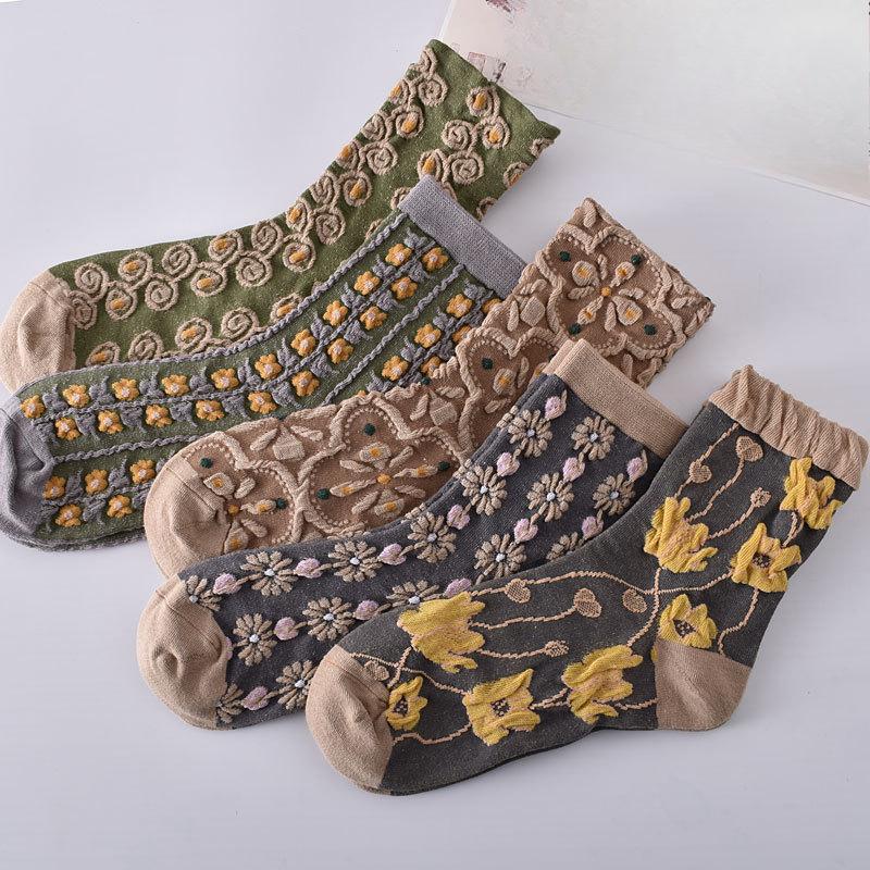 Женские носки до середины икры в придворном ретро этническом стиле, женские осенне-зимние объемные рельефные художественные носки с цветочным узором кофейного цвета