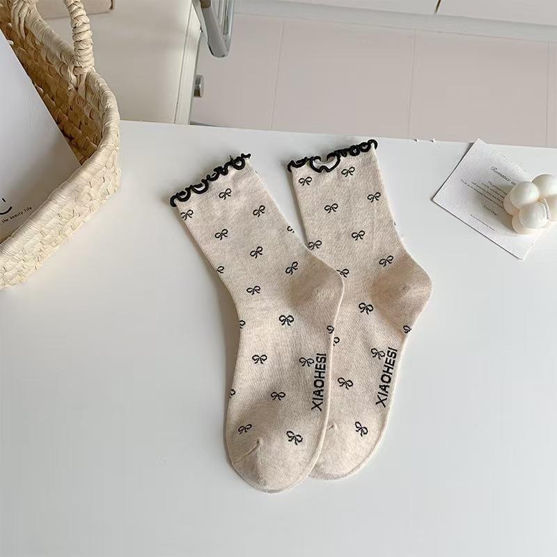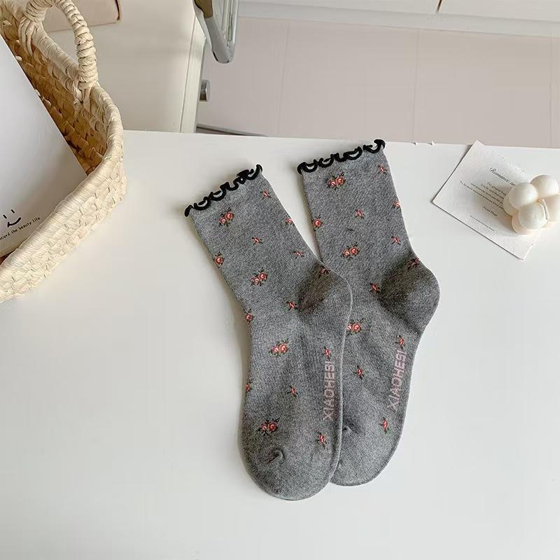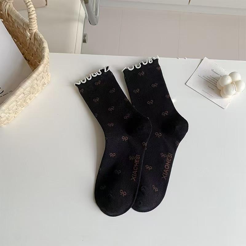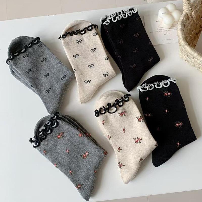 Женские носки для весны и осени: Ретро бант с закатанными краями, мелкие цветочные узоры, черная мид-труба с отделкой ушей, носки с напуском
