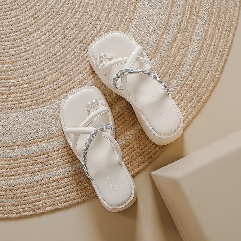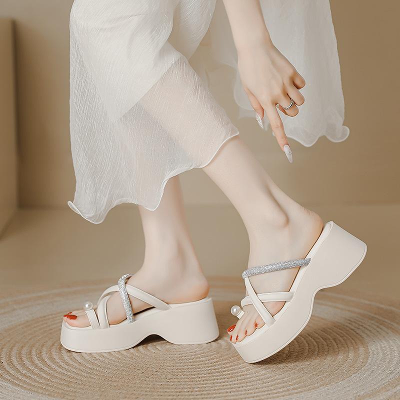 Босоножки на толстой подошве для женщин, летний новый стиль, жемчуг, стразы, сланцы с перемычкой для пальцев, внешние сандалии, подошва «бисквит», шлепанцы для женщин