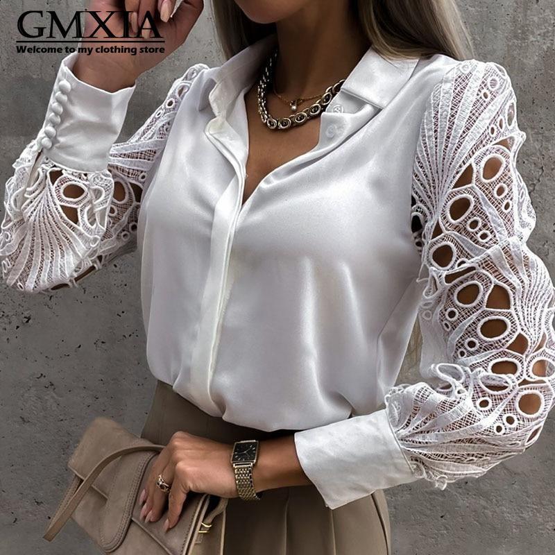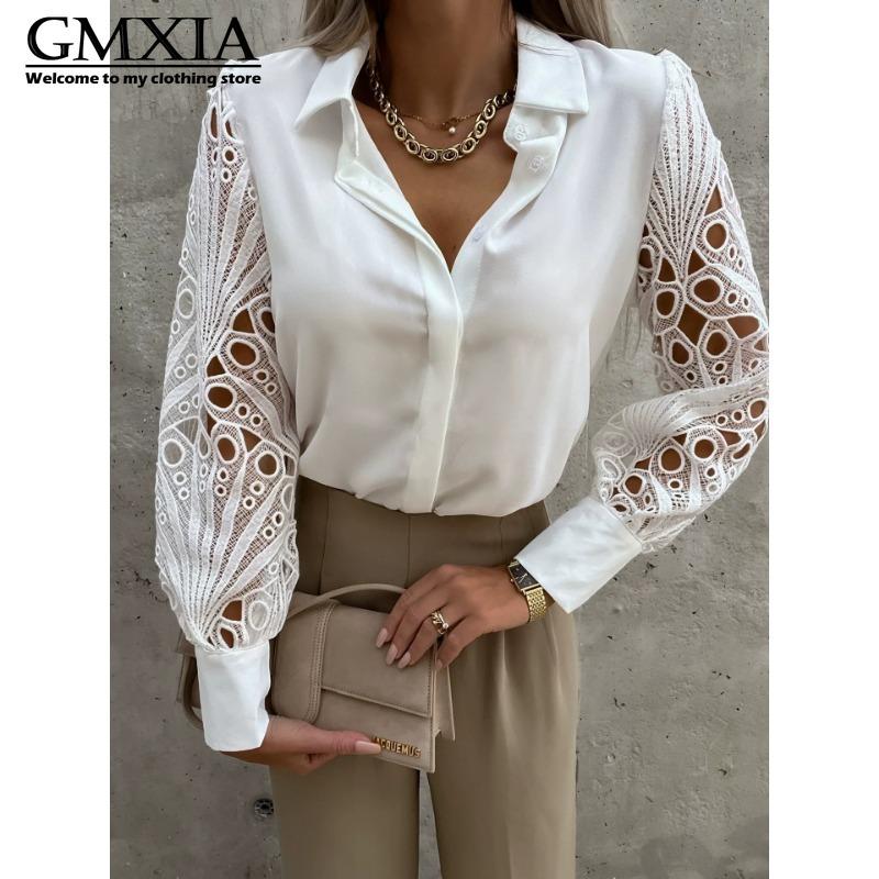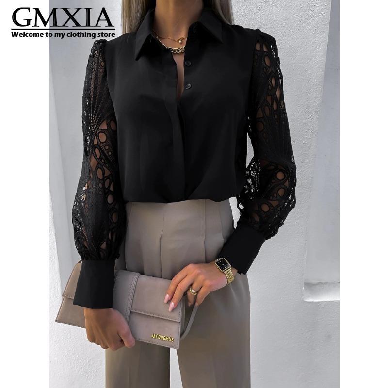 GMXIA Женская мода Повседневный досуг Однотонный принт Длинный рукав Воротник ПОЛО Блузки и рубашки